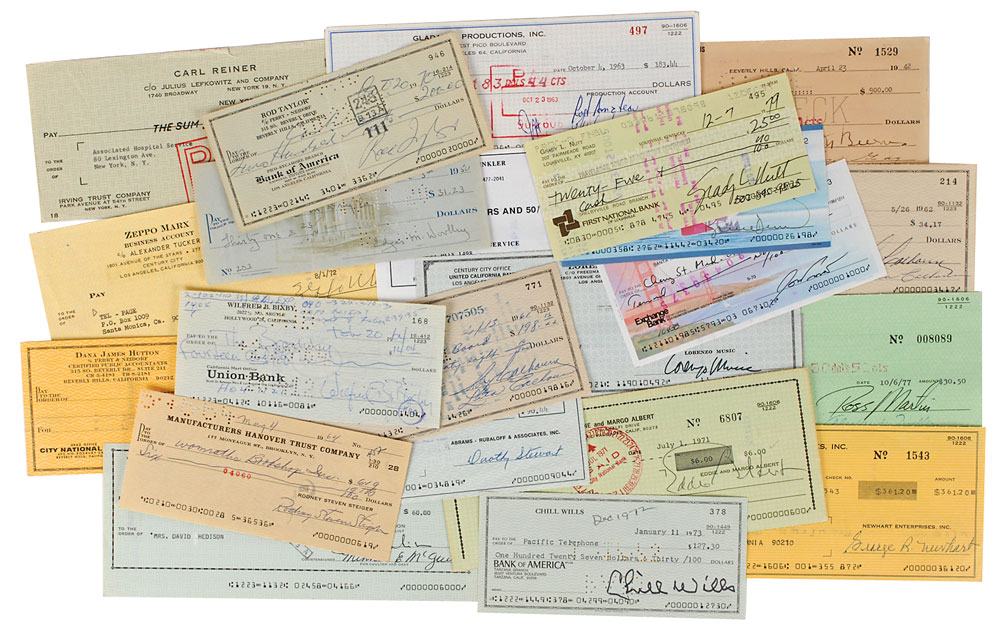 Collection of twenty-two personal and bank checks, ranging in size from 6 x 2.75 to 8.5 x 3.5, each signed by an entertainer, including: Zeppo Marx, Wilfred Bixby, Rod Taylor, Monty Woolley, Rod Steiger, Chill Wills, Bruce Dern, Jon Provost, Grady Nutt, Carl Reiner, Rod Amateau and Phil Silvers, George Burns, David Hedison, Rory Calhoun (2), Ross Martin, Bob Newhart, Henry Winkler, Lorenzo Music, Eddie Albert, Dorothy Stewart, and Jim Hutton (endorsement). In overall fine condition, with small edge tears and vertical folds, and expected bank stamps, notations, and cancellation holes (affecting a few of the signatures).
