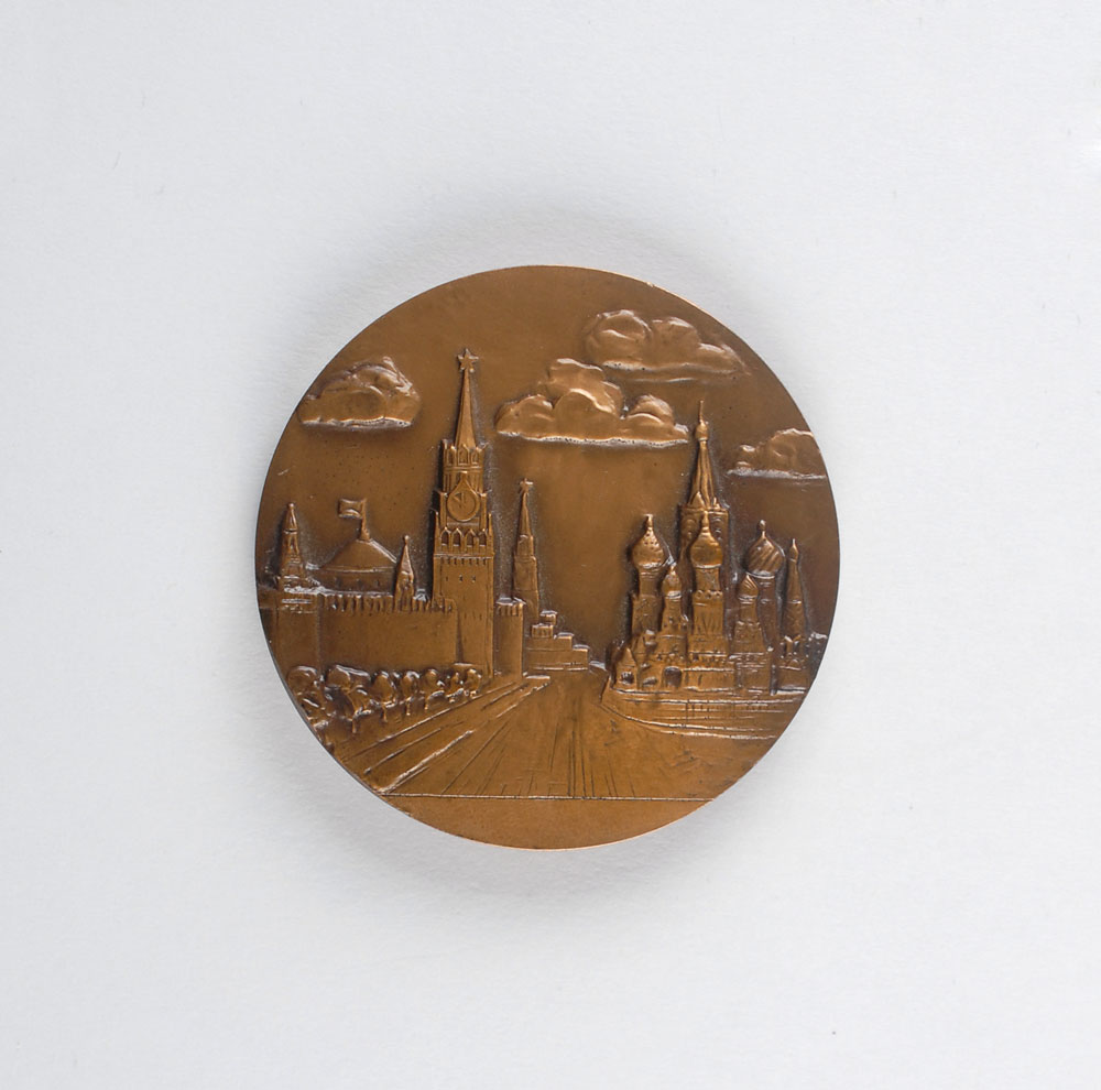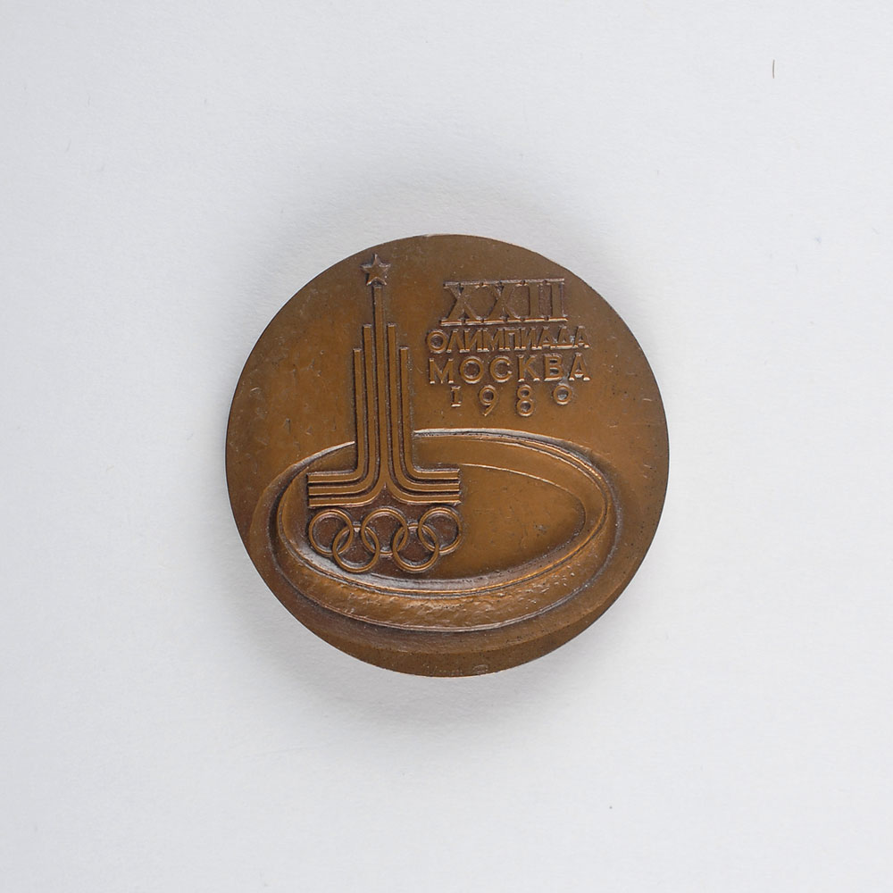 Participation medal issued for the Moscow 1980 Summer Olympics. Tombac, 60 mm, 125 gm, by Angelina Leonova. The front features the Moscow Games emblem above the Olympic stadium and raised Cyrillic lettering; the reverse bears a detailed view of the Red Square in Moscow.