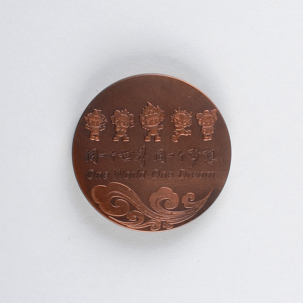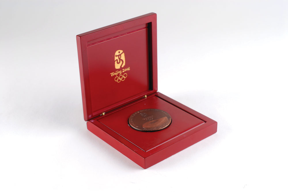 Participation medal issued for the Beijing 2008 Summer Olympics. Bronze, 55 mm, 122 gm. The front features the Beijing Games logo over the Bird’s Nest Olympic stadium, with raised Chinese and English text along the top; the reverse bears five Fuwa mascots over gusts of wind and engraved Chinese and English text, “One World One Dream.” Complete with its original red presentation case.