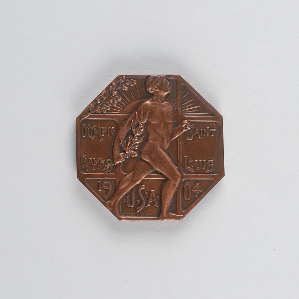 Extremely rare participation medal issued for the St. Louis 1904 Summer Olympics. Copper, 40 mm, 30 gm, by Dieges & Clust, New York. The front, inscribed, “Olympic Games, St. Louis, USA, 1904,” features an idealized nude athlete mid-stride with a laurel branch in his hand; the reverse features the lengthy text, “1803, Universal Exposition Commemorating the Olympic Games, 1904, Physical Culture Department, Frederick J. V. Skiff, Director of Exhibits,” encircled by ivy leaves with the shield emblems of St. Louis, France, and USA. These medals were presented only to athletes and represent the rarest and most valuable of all Olympic participation medals. Fewer than 700 athletes from twelve different countries competed in the 1904 Olympic Games, the smallest representation of nations in the history of the Olympics. The officials’ badges used the same design as this medal but had a loop on the top for a ribbon, while these athletes’ participation medals have an entirely plain edge. Because the Olympics were held in conjunction with the Louisiana Purchase Exposition, these are also desired by World’s Fair collectors. Overall, this is a spectacular example of the most sought-after Olympic participation medal.