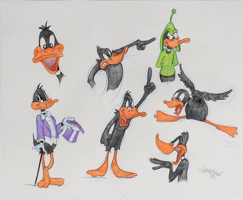 Fantastic original signed graphite and colored pencil sketch of seven versions of Daffy Duck in various degrees of emotion and costume accomplished on a white 16.5 x 13.5 sheet of animation paper, signed in the lower right in pencil by Ross. In fine condition. Pre-certified PSA/DNA.