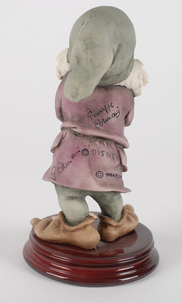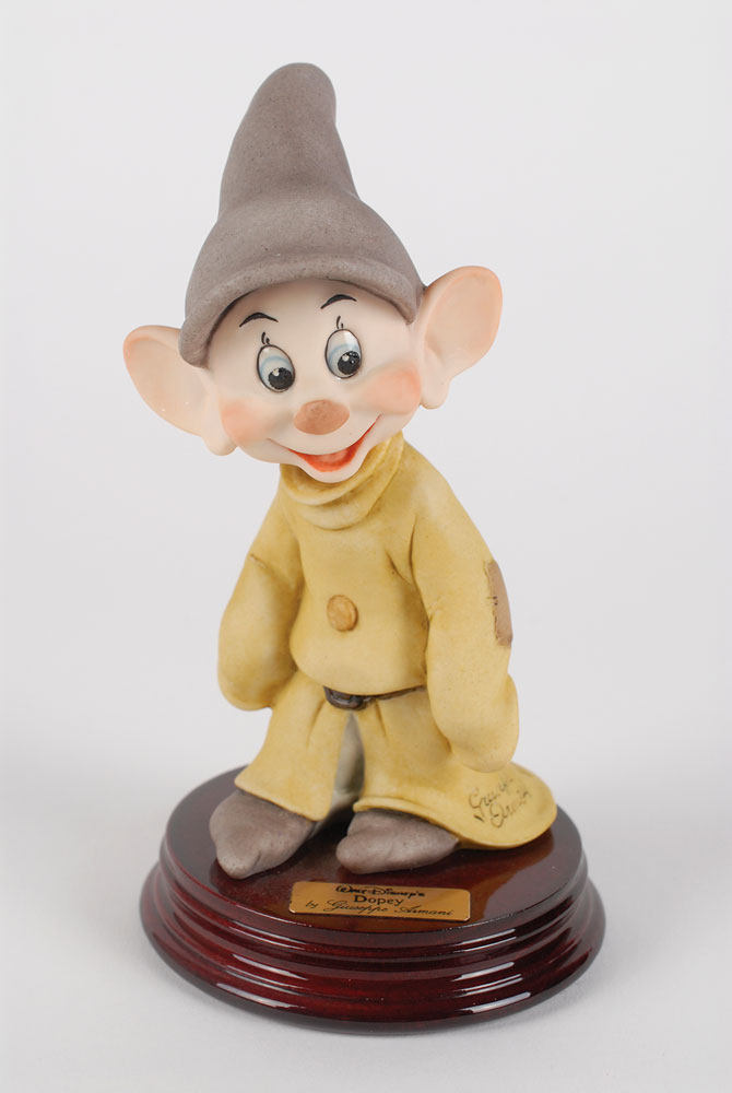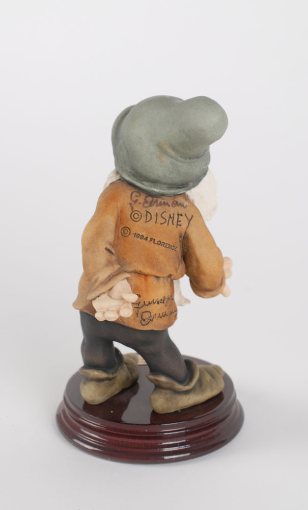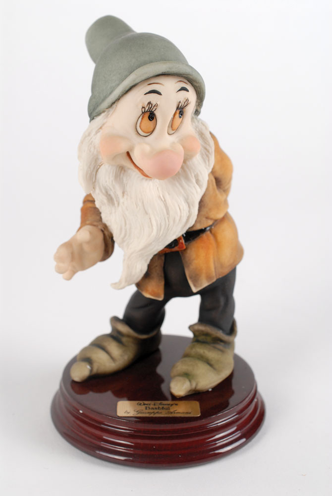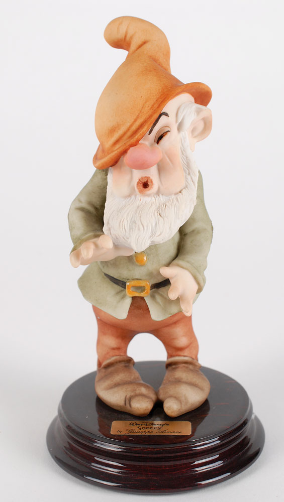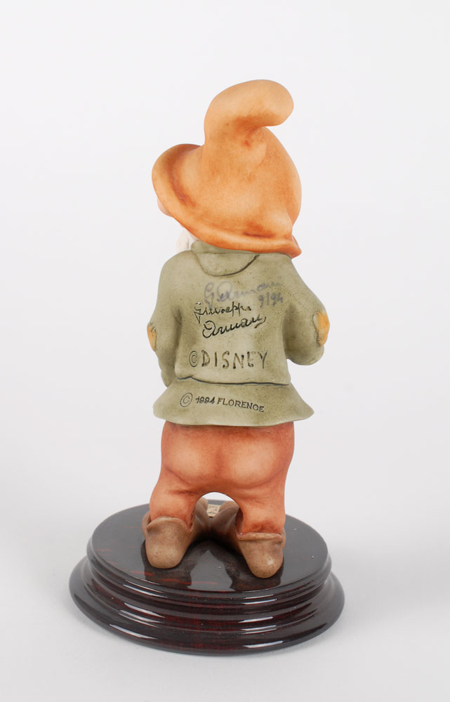 Exceptional set of Armani porcelain figurines of the seven dwarfs from Snow White, all but Dopey signed on the backside in black ink by Giuseppe Armani, who adds the date, “9/94,” to a pair. Each figurine vividly depicts an individual dwarf acting in relation to their namesake—Sneezy, Bashful, Dopey, Sleepy, Doc, Grumpy, and Happy, approximately measuring 6.5″ tall with a 3.5″ base. In overall very fine condition. Released in the 1990s, these wonderful figurines are now long sold out and highly coveted by collectors. Each is accompanied by its original Armani box.