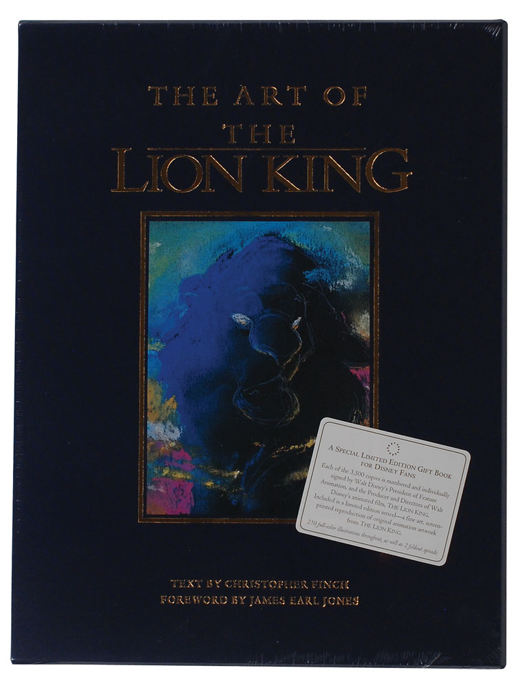 Signed book: The Art of The Lion King. Deluxe edition, first printing, limited to 3500 copies. NY: Hyperion Press, 1994. Hardcover with slipcase, 10.5 x 13.75, 250 pages. Signed by the President of Disney Feature Animation Peter Schneider, and the film’s producers and directors Don Hahn, Rob Minkoff, and Roger Allers. Includes a limited edition screen-printed sericel inside. In very fine condition, in its original, unopened plastic wrap. Having sold out long ago, this is an incredible book that features production artwork from one of Disney’s most beloved and record-breaking films.