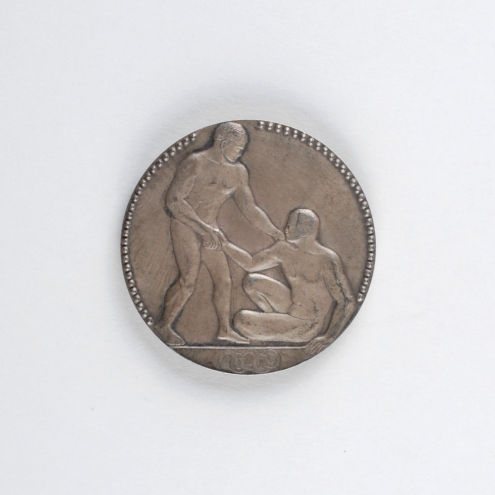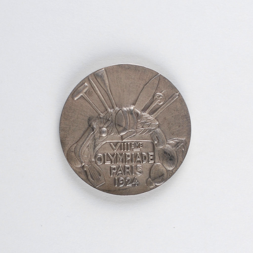 Winner’s medal issued for the Paris 1924 Summer Olympics. Silver, 55 mm, 76 gm, by Andre Rivaud, Paris. The front depicts a triumphant athlete extending his hand to a fallen opponent, with the designer’s name “A. Rivaud” etched below his foot, and the Olympic rings at the bottom; the reverse, inscribed, “VIIIeme Olympiade, Paris 1924,” depicts a harp and various pieces of sporting equipment. Stamped “Argent” on the edge. Includes a leather presentation box. The winner’s medals for this Olympics were the first to incorporate the Olympic rings into the design. Only 304 of these attractive second-place silver medals were issued.