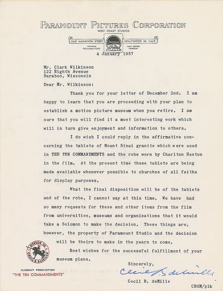 TLS, one page, 8.5 x 11, Paramount Picture Corporation letterhead, January 4, 1957. Letter to Clark Wilkinson, in part: “I do wish I could reply in the affirmative concerning the tablets of Mount Sinai granite which were used in The Ten Commandments and the robe worn by Charlton Heston in the film. At the present time these tablets are being made available whenever possible to churches of all faiths for display purposes. What the final disposition will be of the tablets and of the robe, I cannot say at this time. We have had so many requests for these and other items from the film from universities, museums and organizations that it would take a Solomon to make the decision.” In fine condition, with trivial creasing to top edge. Pre-certified PSA/DNA.