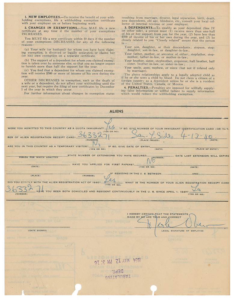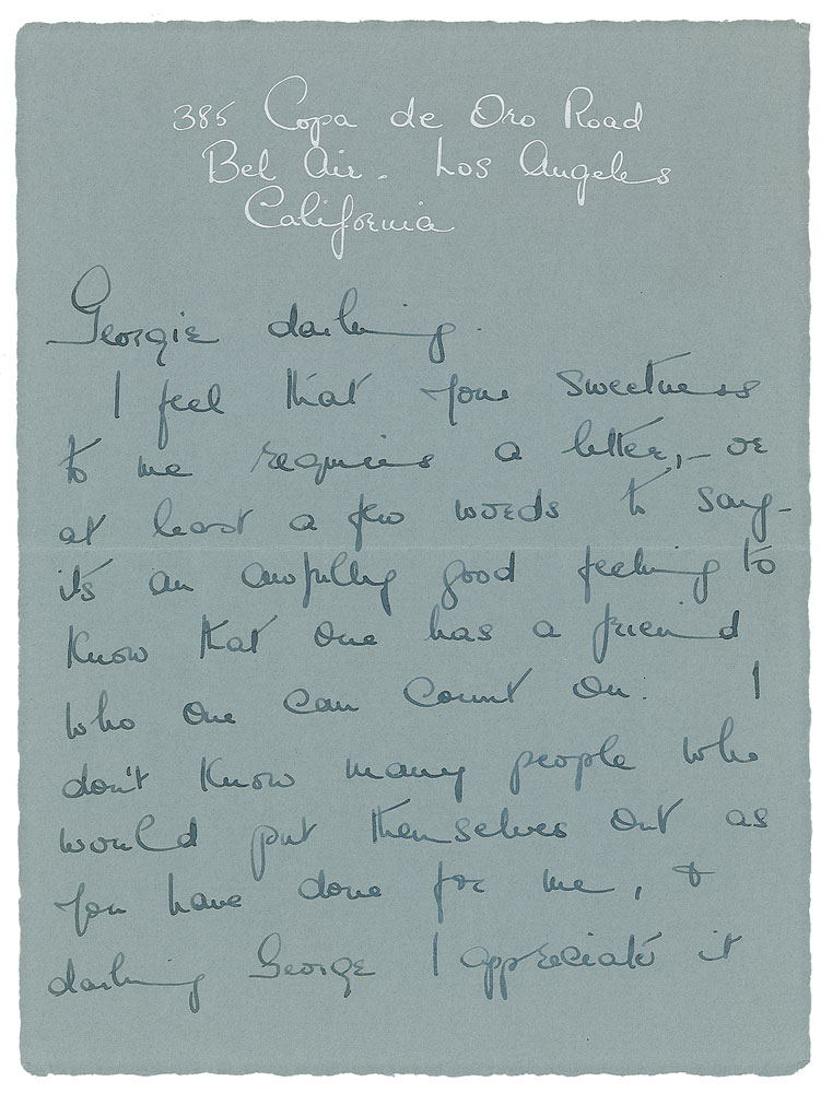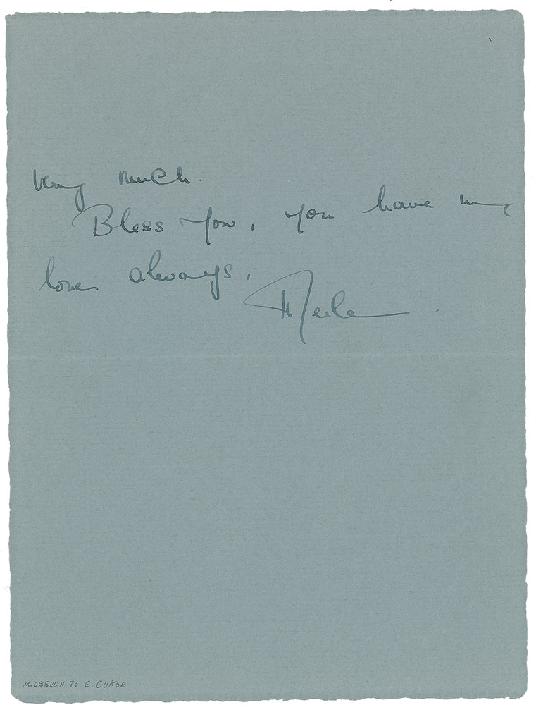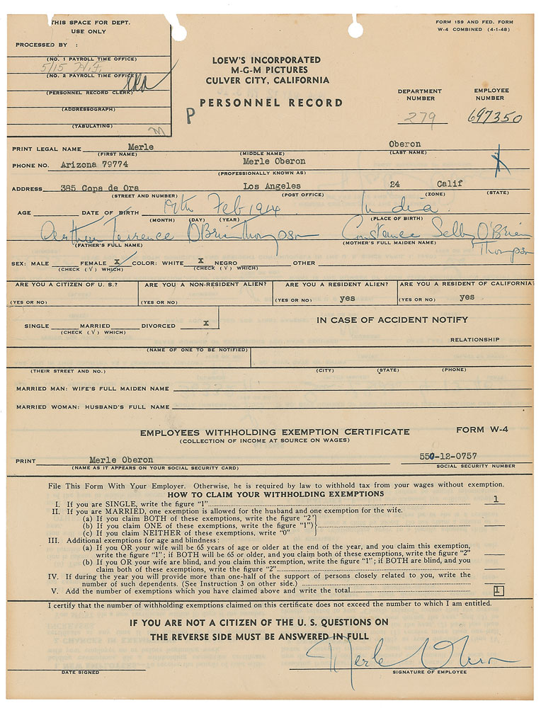 Two items: ALS signed “Merle,” one page both sides, 6 x 8, Copa de Oro letterhead, no date, letter to director George Cukor, in full: “I feel that your sweetness to me requires a letter,—or at least a few words to say it’s an awfully good feeling to know that one has a friend who one can count on. I don’t know many people who would put themselves out as you have done for me, & darling George I appreciate it very much”; and a DS, one page both sides, 8.5 x 11, April 13, 1940. Loew’s Incorporated & MGM Pictures personnel record, filled out and signed in blue ballpoint by Oberon on the front, adding her date of birth, place of birth, and the full names of her parents. Oberon also fills out the reverse side designated for resident aliens, signing again at the conclusion. In overall fine condition, with toning and tears to filing holes to DS. Pre-certified PSA/DNA.