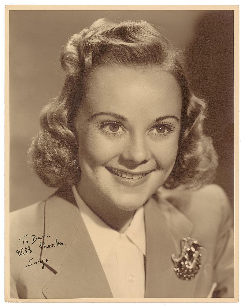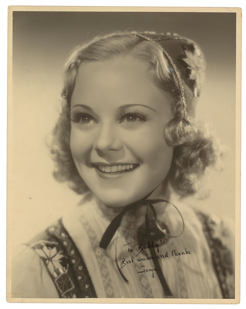 Beautiful set of three vintage matte-finish 11 x 14 photos of Henie, each signed “Sonja” and inscribed in fountain pen to make-up artist Buddy Westmore. In overall fine condition, with slight wear, pin holes, chipping, and creasing to edges. Pre-certified PSA/DNA.