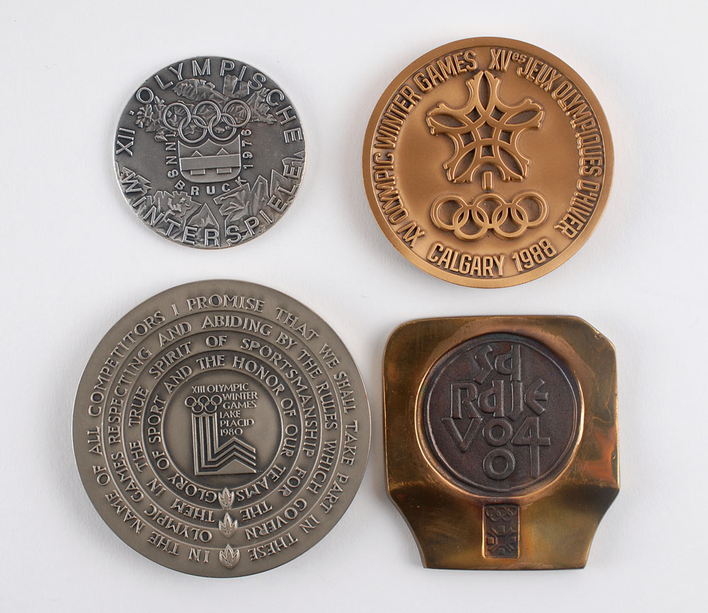 Desirable collection of participation medals issued for four consecutive Winter Olympics, including: 1976 Innsbruck Winter Olympics, silvered bronze, 50 mm, 32 gm; 1980 Lake Placid Winter Olympics, nickel-silver, 76 mm, 202 gm; 1984 Sarajevo Winter Olympics, bronze, 60 mm x 66 mm, 129 gm; 1988 Calgary Winter Olympics, bronze, 64 mm, 133 gm. A handsome ready-made collection of medals spanning four Olympic Games.