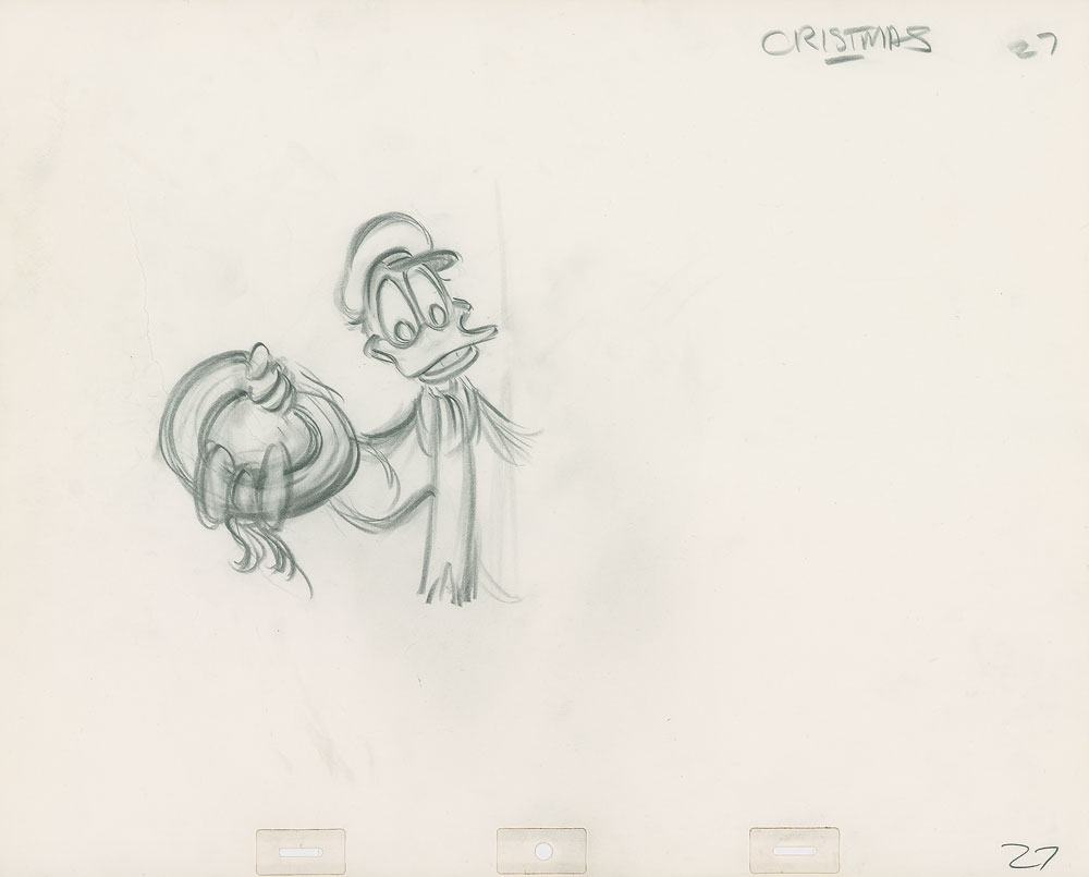 (Walt Disney Studios, 1983) Original production drawing from the Dickensian short film Mickey’s Christmas Carol, showing a jovial Donald Duck with a scarf around his neck and holding up a Christmas wreath. Accomplished in graphite on untrimmed 15.5 x 12.5 animation paper. Image measures 5.25 x 5.5. Trivial surface impressions and some creasing to left side, otherwise fine condition.
