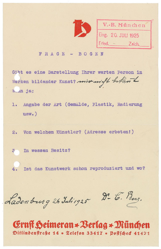 German engineer and founder of Mercedes-Benz (1844–1929) who, after graduating from the University of Karlsruhe at the age of 19, went on to develop one of the first practical internal combustion engines, revolutionizing the history of the automobile. Desirable TLS in German, signed “Dr. C. Benz, Ladenburg, 26th July 1925,” one page, 5.5 x 8.75, Ernst Heimeran letterhead, stamp-dated July 20, 1925. Letter in questionnaire form directed to Benz. The first inquiry (translated): “Is there a representation of your own personal values in any work of art?” Benz adds a handwritten response, (translated): “Not that I know of.” In fine condition, with filing holes to left edge. Pre-certified PSA/DNA.