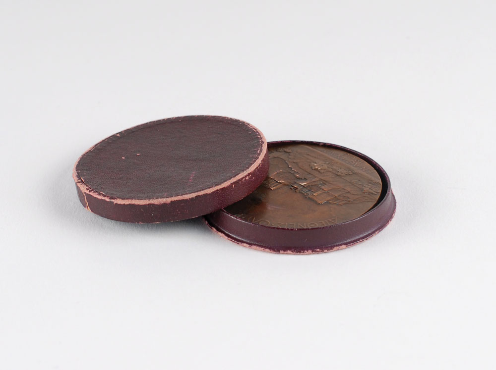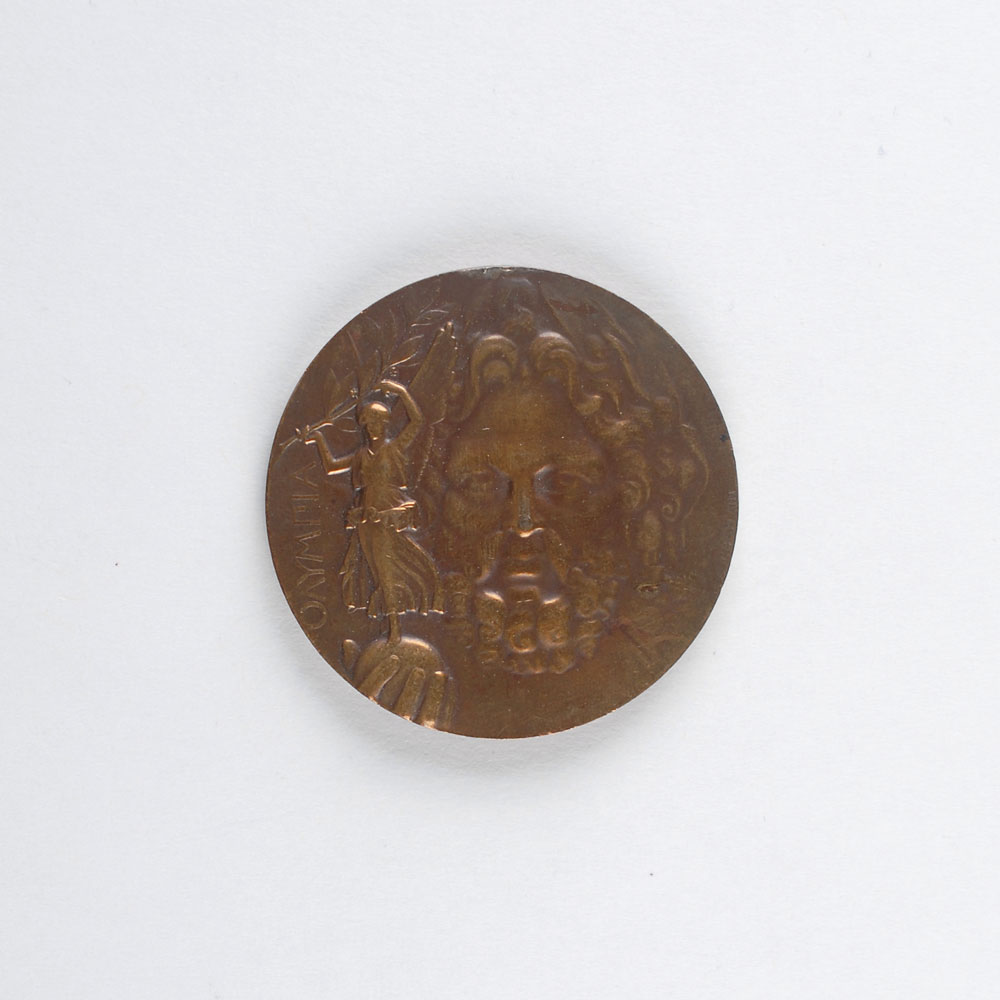 Winner’s medal issued for the Athens 1906 Summer Olympics. Bronze, 50 mm, 58 gm, by Jules Clement Chaplain, Paris. The front features a portrait of Zeus holding Nike, the goddess of victory; the reverse features a view of Athens within a Greek legend. Stamped “Bronze” on the edge. Complete with presentation box. The 1906 Athens Games were considered the Olympics by the press and participants, which included 854 athletes from twenty countries, but they were never officially sanctioned by the International Olympic Committee.