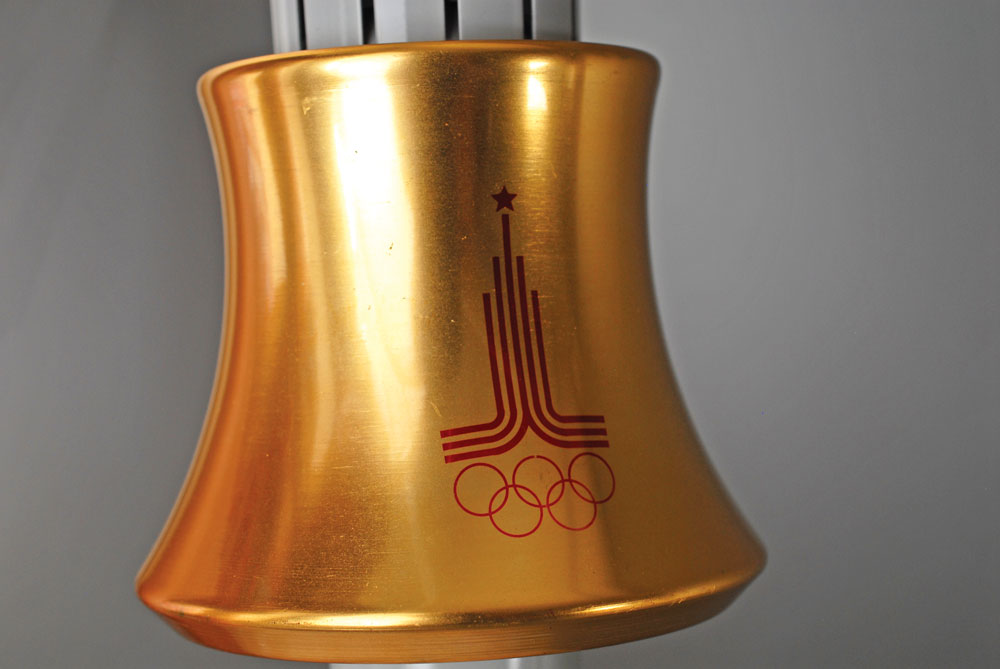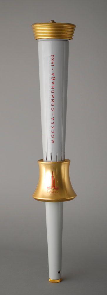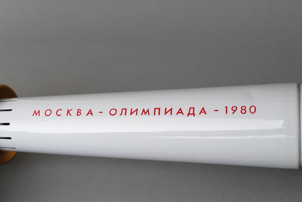 Official 1980 Moscow Olympics torch, comprised of aluminum, measuring 22″ in length and 4″ at its widest point, designed by Boris Tutschin. The gray body features red text in Cyrillic, “Moscow—Olympiad—1980,” and a gold-colored top of the handle bears the emblem of the Games and Olympic rings. The top is also accented with a golden ring. Burner remains in place. A few dings and dents to the body. In all, about 5,435 torchbearers participated in the relay, which lasted from June 19 to July 19. These Olympics were especially controversial due to the USSR’s recent invasion of Afghanistan, and the United States led 65 countries in a boycott of the Games.