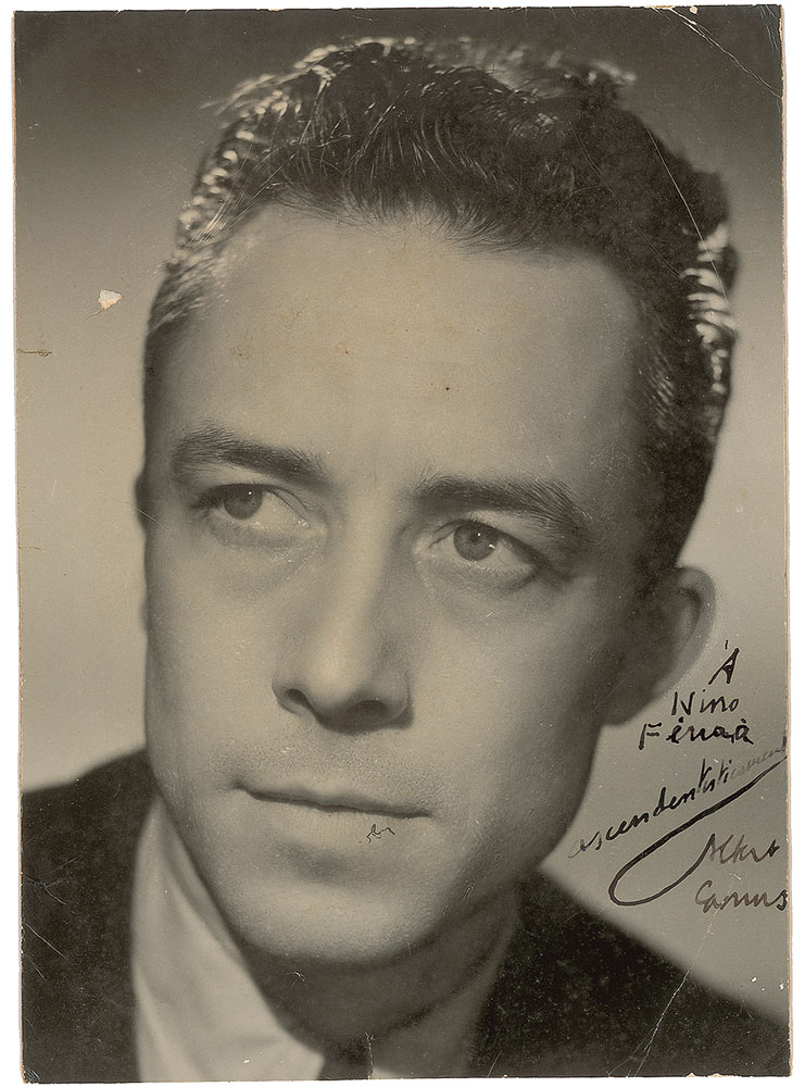 Handsome vintage glossy 6.25 x 8.75 head-and-shoulders portrait of Camus, signed and inscribed in fountain pen in French. Affixed to a cardstock mount. In very good condition, with moderate overall creasing, some cracks and spots of surface loss to emulsion, and closely trimmed edges. A rare and desirable format. Pre-certified PSA/DNA.