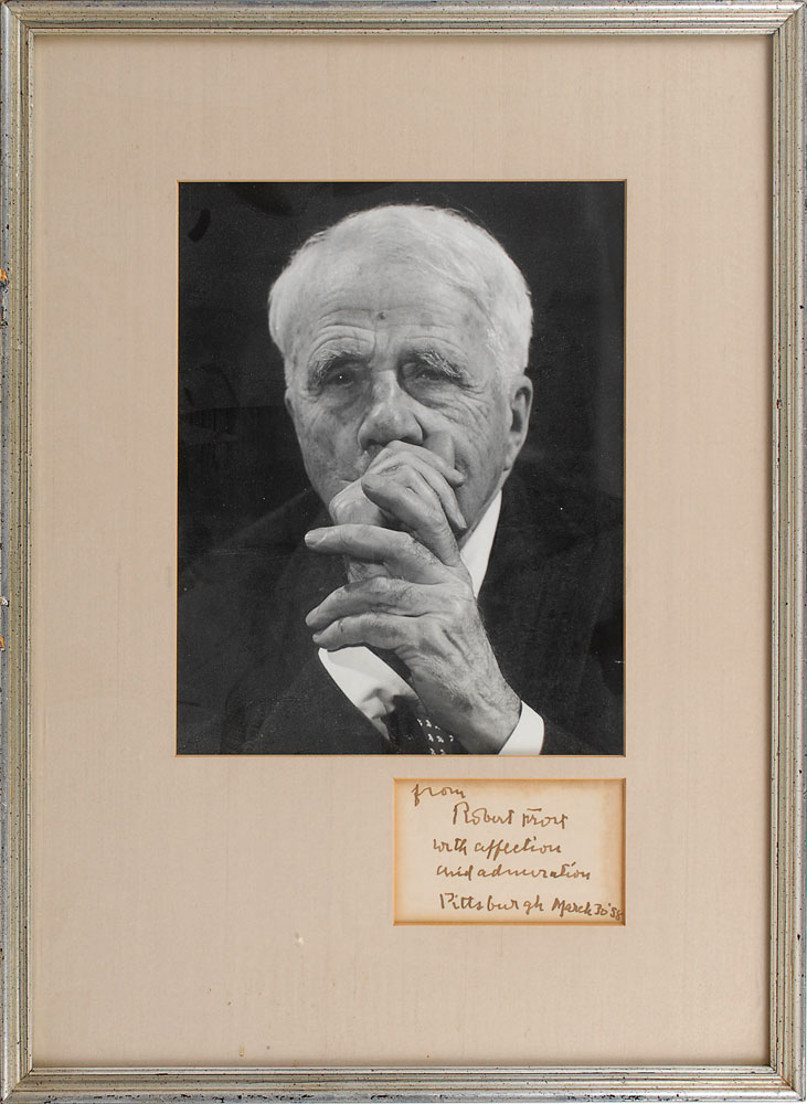 Ink signature, “From Robert Frost, with affection and admiration, Pittsburgh, March 30, ‘58,” on an off-white 3.75 x 2.25 sheet. Matted and framed with a large image of Frost in a contemplative pose to an overall size of 13 x 17.75. Irregular toning to edges, otherwise fine condition. Pre-certified PSA/DNA.