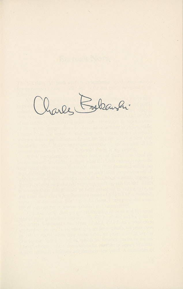 Signed book: Screams from the Balcony. First edition, limited issue, numbered 192/300. Santa Rosa: Black Sparrow Press, 1993. Hardcover handbound in boards by Earle Gray, 6.5 x 9.25, 372 pages. Signed on an opening page in black ballpoint, “Charles Bukowski,” and also signed in black felt tip, “Buk,” on an original color print bound into this version of the book. In fine condition. Pre-certified PSA/DNA.