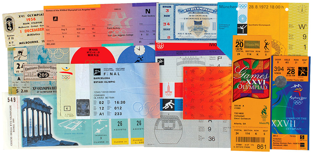 Comprehensive collection of fourteen tickets and ticket stubs from different Summer Olympic Games, ranging in size from 2.75 x 1 to 9.75 x 3.75, including: 1904 Louisiana Purchase Exposition St. Louis World’s Fair (host of the Olympics); 1932 Los Angeles; 1952 Helsinki; 1956 Melbourne; 1960 Rome; 1964 Tokyo; 1972 Munich; 1976 Montreal; 1980 Moscow; 1984 Los Angeles; 1992 Barcelona; 1996 Atlanta; 2000 Sydney; and 2008 Beijing.