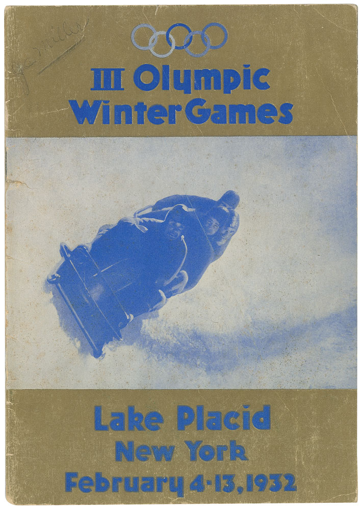 Three programs for the Winter Olympic Games, including: 1932 Lake Placid daily program for February 13; 1932 Lake Placid general program; and 1960 Squaw Valley daily program for February 23. Partial separation to the spine of the 1932 general program and a couple small areas of paper loss to the back cover of the 1960 program.