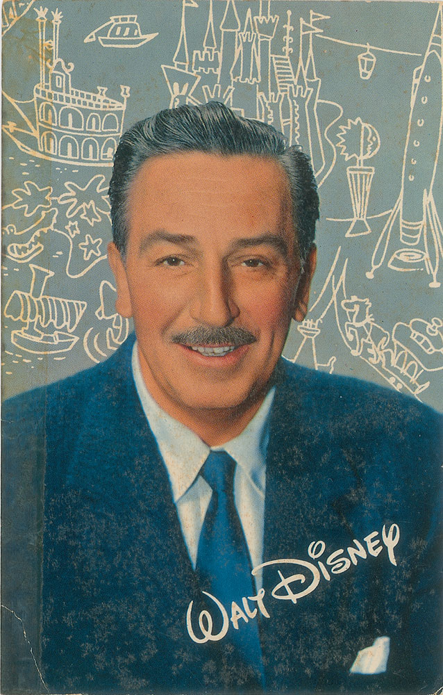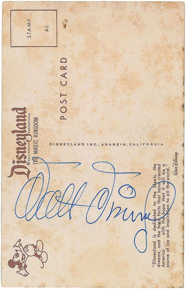 Desirable vintage color Disneyland postcard depicting Walt Disney in a head-and-shoulders pose on the front, 3.5 x 5.5, signed on the reverse in blue ballpoint. Scattered soiling and a toned strip of tape to left edge of front, and overall light foxing to reverse, otherwise fine condition; the signature remains crisp and bold. Accompanied by a photocopied e-mail from the original recipient, in part: “This autographed picture postcard of Walt Disney was signed by Walt at Disneyland, the very first week Disneyland opened, July of 1955. My mom and dad took my sister and I to Disneyland and while we were wandering down Main Street my dad saw Walt Disney. My dad hurried into a souvenir shoppe and purchased two postcards with Walt Disney’s photograph on the front. Walt was gracious enough to autograph them both, one for me and one for my sister.” Disneyland opened on July 17, 1955, and has since welcomed thousands upon thousands of visitors through its gates on a daily basis. One of the first examples sold at the park’s souvenir shops, this is a remarkable postcard, signed during the park’s magical and tumultuous debut week of operation. Pre-certified Phil Sears.