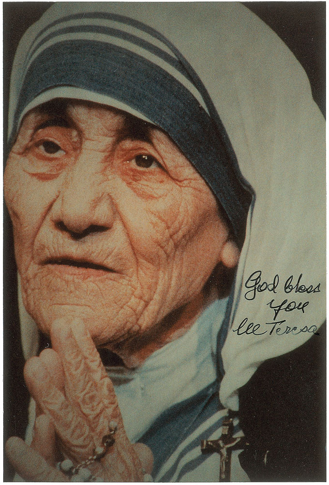 Color glossy 4 x 5.75 photo of Mother Teresa with her hands together in prayer, signed in black ink, “God bless you, M. Teresa.” Reverse is stamp-dated March of 1993. In fine condition, with a slightly grainy quality to the image. Pre-certified PSA/DNA.