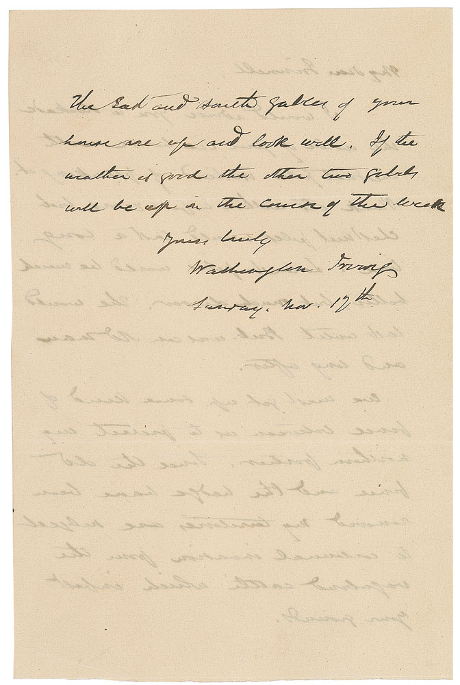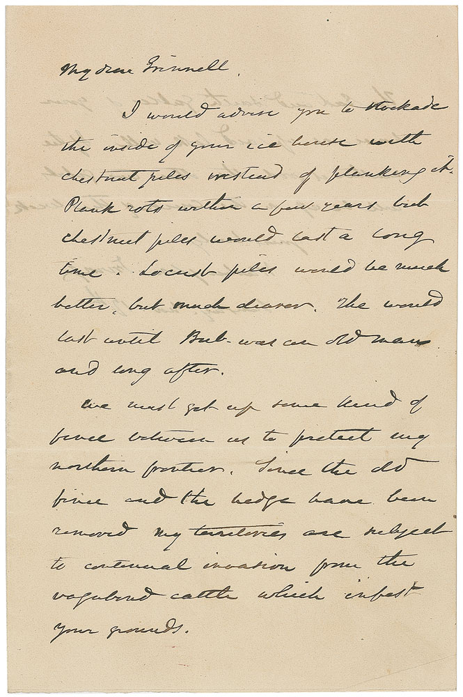 ALS, two pages, 4.75 x 7.25, November 12, no year. Letter to his neighbor and niece’s husband, Moses H. Grinnell, in full: "I would advise you to stockade the inside of your ice house with chestnut piles instead of planking it. Plank rots within a few years but chestnut piles would last a long time. Locust piles would be much better, but much dearer. The [house] would last until Bub. was an old man and long after. We must get up some kind of fence between us to protect my northern frontier. Since the old fence and the hedge have been removed my territories are subject to continual invasion from the vagabond cattle which infest your grounds. The East and South Gables of your house are up and look well. If the weather is good the other two Gables will be up in the course of the week.” In fine condition, with a crease to lower right corner and trivial show-through from writing to opposing sides. Pre-certified PSA/DNA.