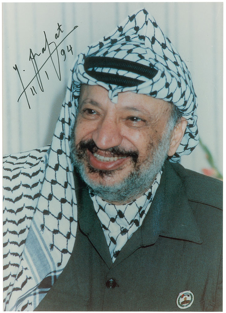 Color glossy 5 x 7 photo of the Palestinian leader, signed in black ink, “Y. Arafat,” adding the date of November 1, 1994. In fine condition, with unobtrusive mounting remnants to reverse. Pre-certified PSA/DNA.