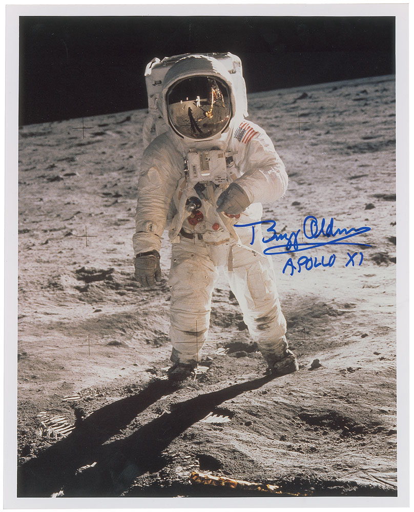 Color semi-glossy 8 x 10 full-length photo of Aldrin standing on the lunar surface, the reflection of Neil Armstrong in his visor, signed in blue felt tip, “Buzz Aldrin, Apollo XI.” In very fine condition. Pre-certified Zarelli Space Authentication.
