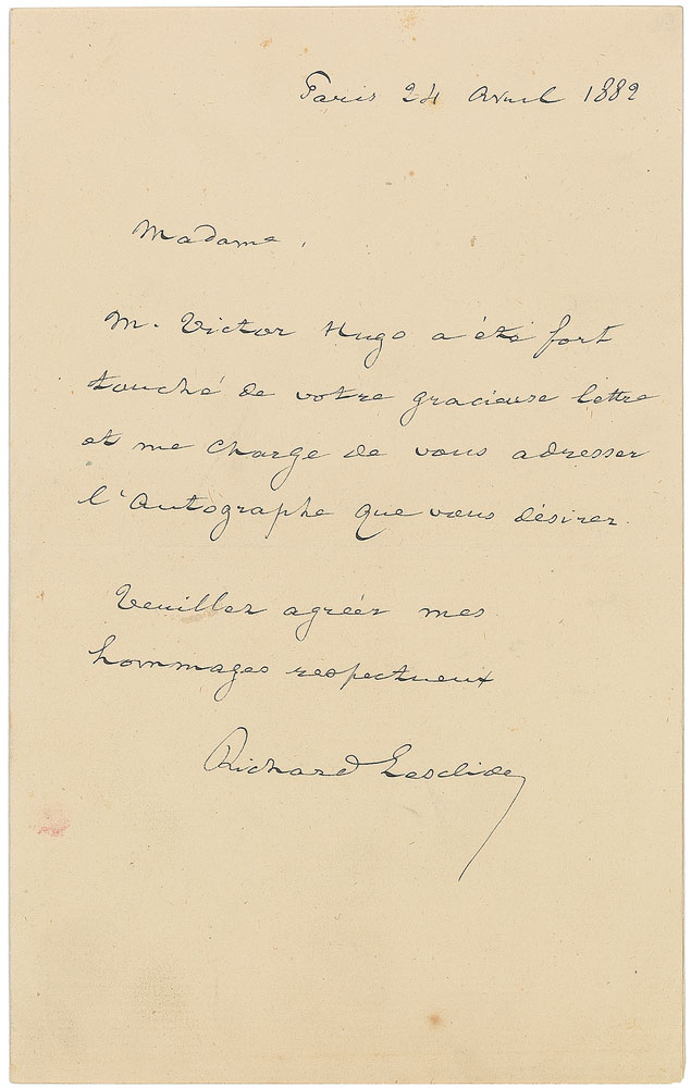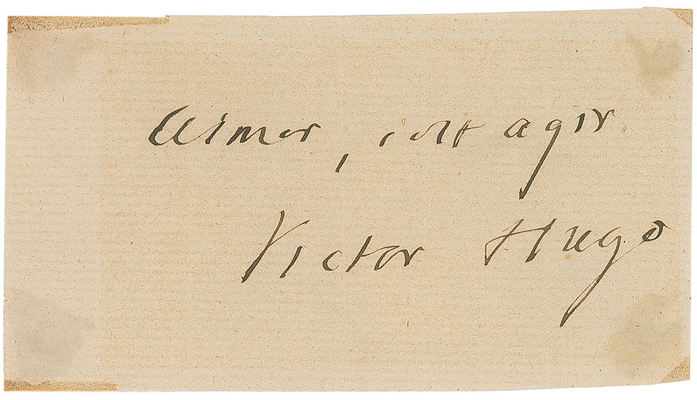 Large and bold ink signature, “Victor Hugo,” and sentiment in French on an off-white 5.5 x 3 slip. Uniform toning, some adhesive remnants to corners, and light show-through from toned mounting remnants to reverse, otherwise fine condition. Accompanied by the original letter of transmittal from his secretary Richard Lesclide, dated April 24, 1882, thanking the correspondent for her letter and enclosing the autograph. Pre-certified PSA/DNA.