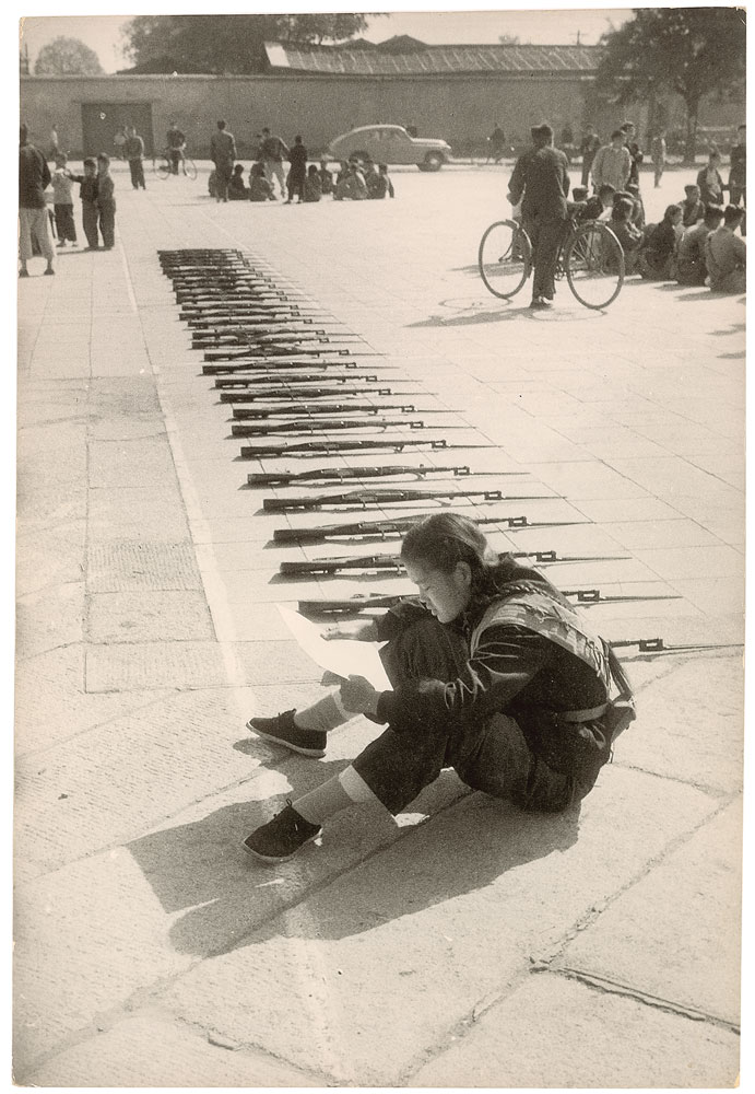 Unsigned matte-finish 7.75 x 11.5 photo of a young woman in the People’s Militia sitting on the ground and reading with a line of rifles in the background, bearing a photographer’s stamp on the reverse by “Henri Cartier-Bresson & Magnum Photos.” In fine condition, with mild surface creases.