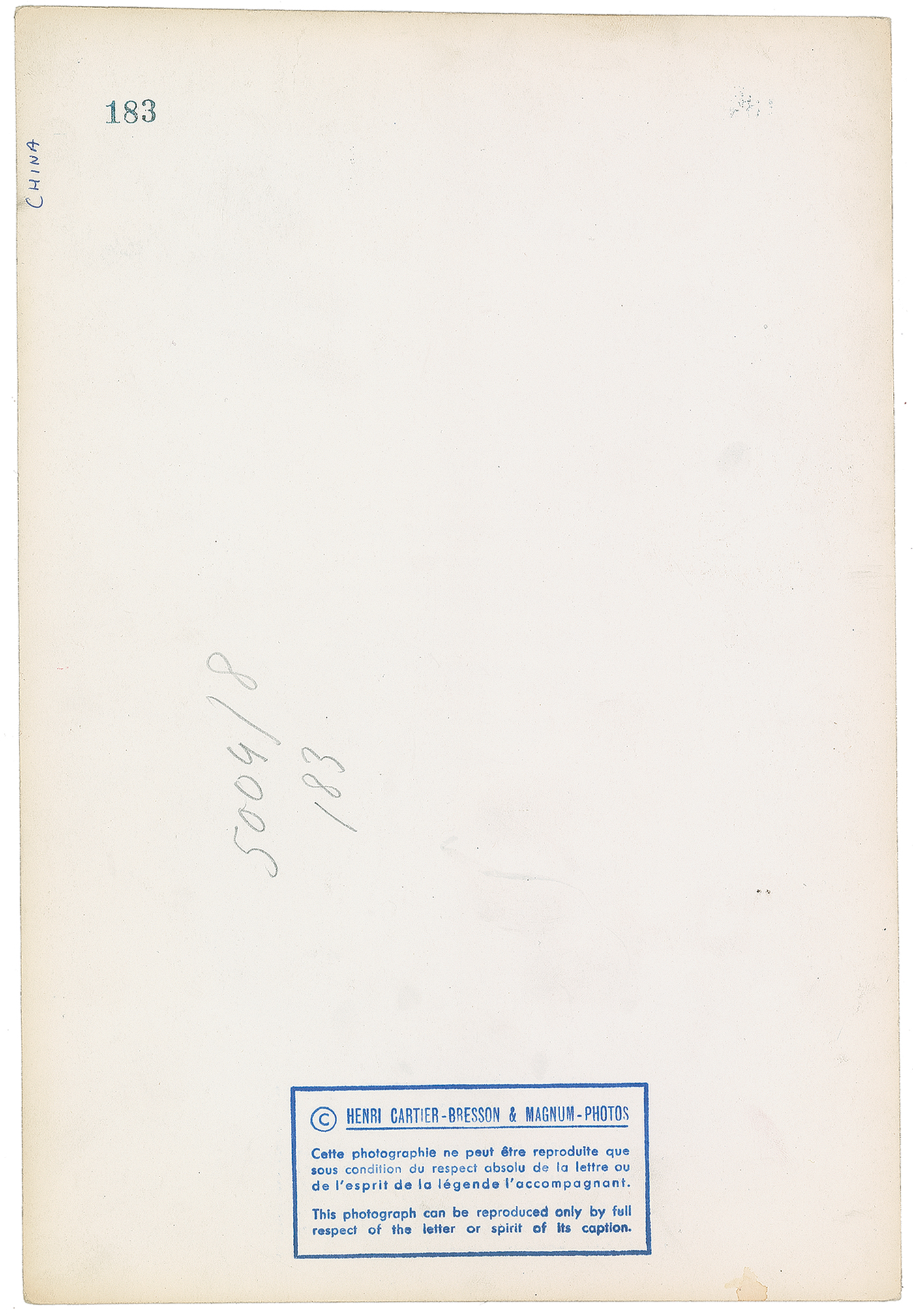 Henri Cartier-Bresson's pioneering work in photojournalism elevated the genre of candid street photography to fine art in its ability to capture what he termed the 'Decisive Moment.' He founded the iconic Magnum Photos cooperative in 1947 with a group of other important photojournalists, who split up assignments among the members to cover news around the globe. Cartier-Bresson was first assigned to China and India, where he covered the last stages of the Chinese Civil War in 1949 and left as the Communist regime took power. These photos come from his return to China in the late 1950s, when he traveled thousands of miles throughout the country to depict Chinese life during the 'Great Leap Forward.' These photographs were printed during the same period they were taken, confirmed by his appropriate inkstamp on the reverse, making them extremely sought after by collectors.