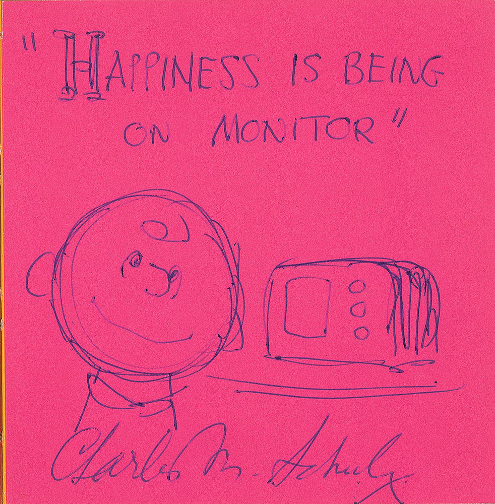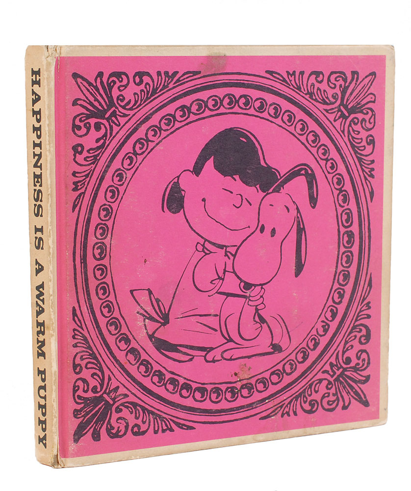 Signed book: Happiness Is a Warm Puppy. First edition. San Francisco: Determined Productions, 1962. Hardcover, 5.75 x 5.75. Signed on the first free end page in ballpoint, “‘Happiness is being on Monitor,’ Charles M. Schulz,” with the addition of a fantastic sketch of Charlie Brown watching TV. Also bears a gift inscription in another hand on the front pastedown. Autographic condition: fine. Book condition: VG-/None. Accompanied by a letter of provenance from the original owner, noting that his father was a journalist who interviewed Schulz while filling in as the host of the NBC show Monitor. Pre-certified PSA/DNA.