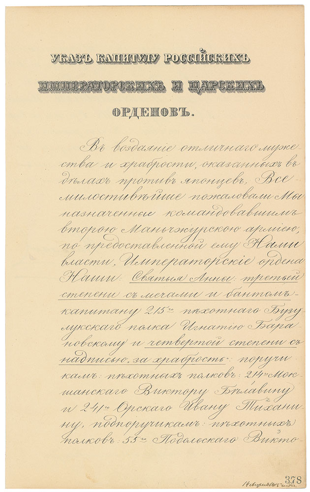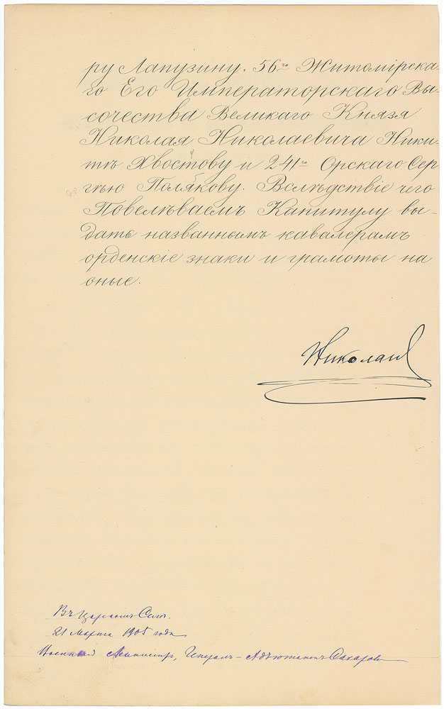 Sought-after manuscript DS in Cyrillic, one page both sides, 8.75 x 14, March 21, 1905. Untranslated document in which the czar awards various decorations to soldiers who distinguished themselves in the disastrous war against Japan. In fine condition, with one closely trimmed edge. Pre-certified PSA/DNA.