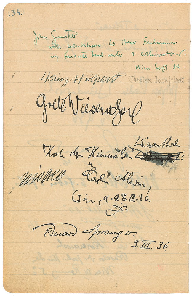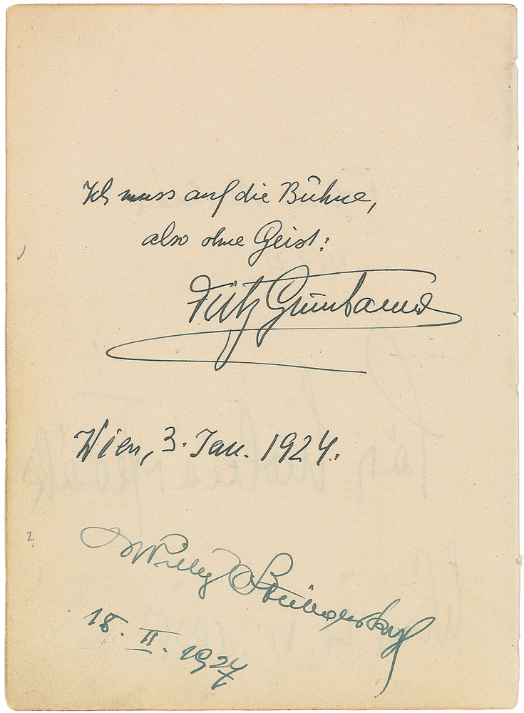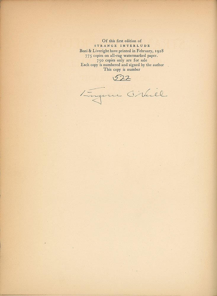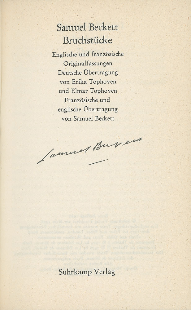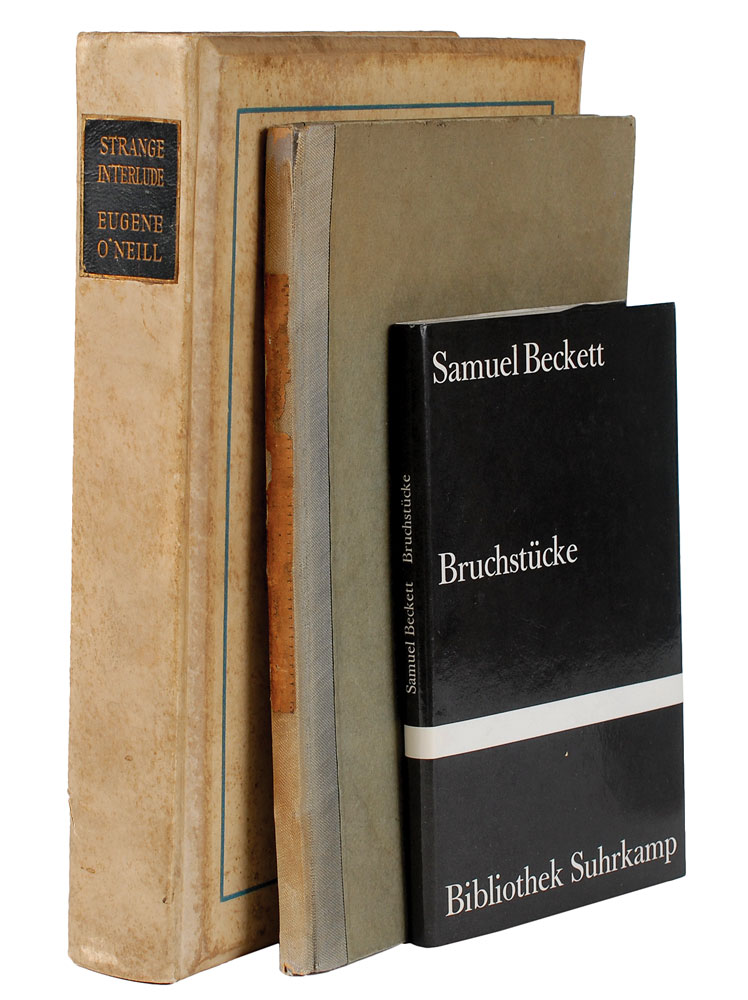 Diverse collection of items signed by a wide range of authors and other notable figures, including three books and five album pages, including: hardcover trilingual edition of Bruchstucke [Fragments] by Samuel Beckett, signed on the title page in black felt tip; hardcover edition of Der Bogen des Odysseus [The Bow of Odysseus] by Gerhart Hauptmann, signed and inscribed on the first page in fountain pen; hardcover limited edition of Strange Interlude by Eugene O’Neill, numbered 522/775, signed on the colophon in fountain pen; and five album pages of various sizes signed on both sides in fountain pen by a variety of figures. Most notable is a page headed by journalist John Gunther, who signs, “John Gunther, with salutations to...my favorite head waiter and collaborator, Wien Sept. ‘36” (the year he published Inside Europe). Other notable signers include: novelist Fannie Hurst; writer Irvin S. Cobb; explorer Alexandra David Neel; choreographer Grete Wiesenthal; conductor Karl Alwin; philosopher Eduard Spranger; dramatist Ferenc Molnar; actress Sari Molnar Fedak; actor Fritz Grunbaum; dramatist Georg Kaiser; director Max Reinhardt; actress Lucy Kieselhausen; actor Otto Schmole; and actress Charlotte Auder. In overall very good to fine condition. Quite an interesting collection highlighted by the three books signed by winners of the Nobel Prize in Literature. Pre-certified PSA/DNA.