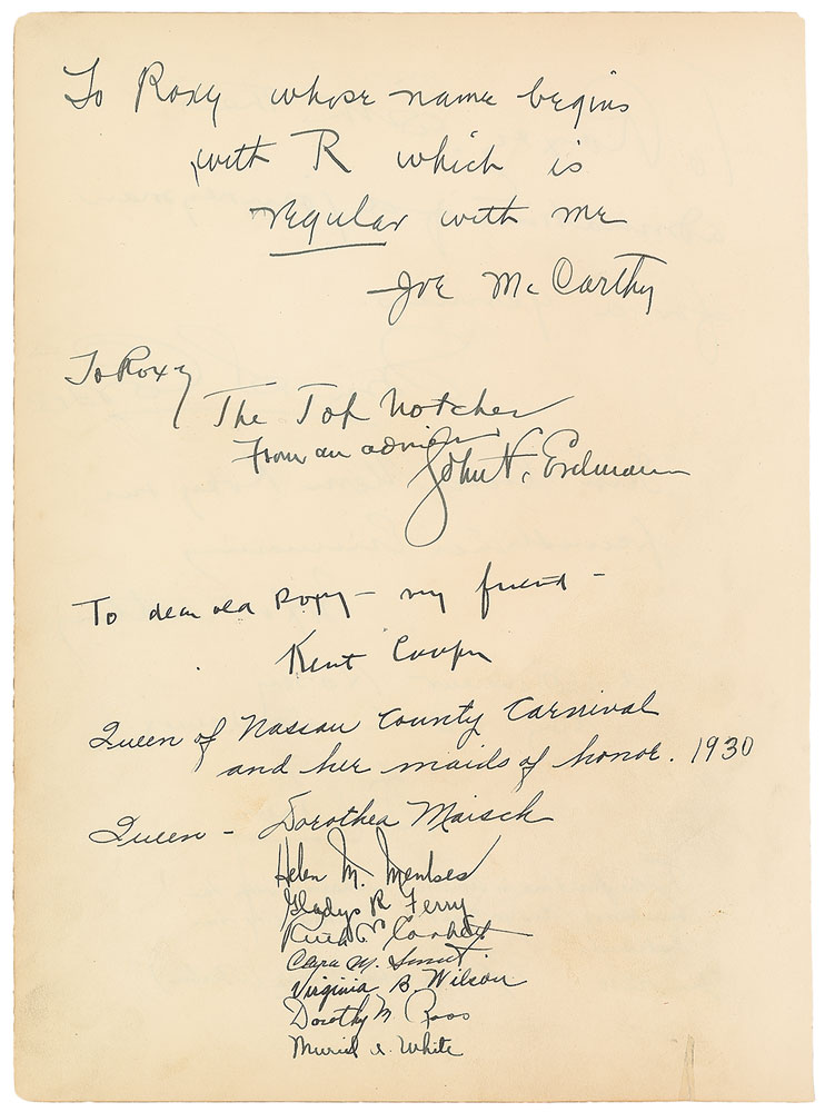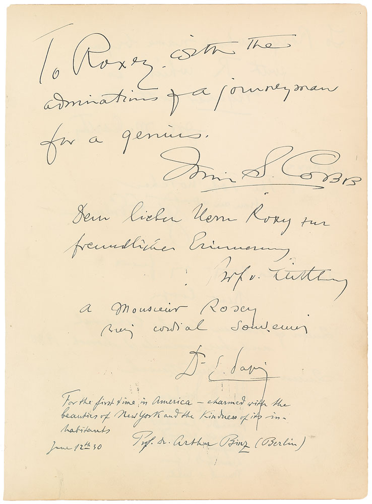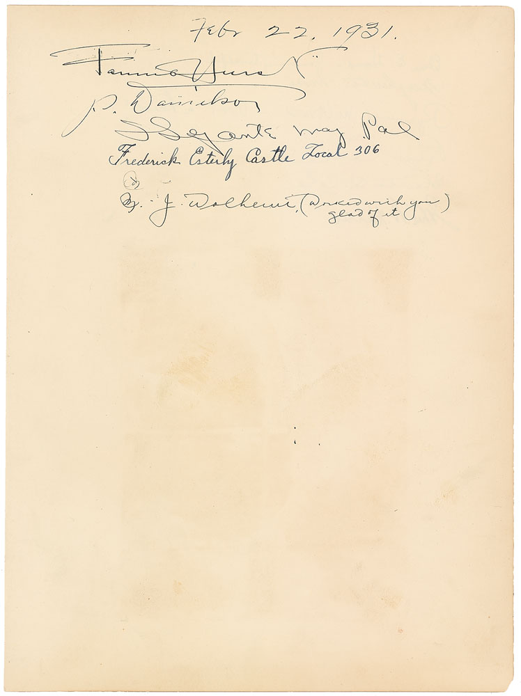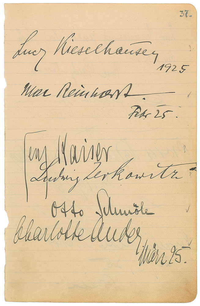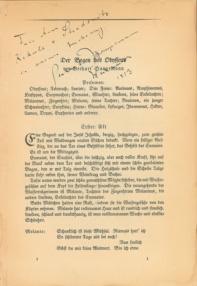 Diverse collection of items signed by a wide range of authors and other notable figures, including three books and five album pages, including: hardcover trilingual edition of Bruchstucke [Fragments] by Samuel Beckett, signed on the title page in black felt tip; hardcover edition of Der Bogen des Odysseus [The Bow of Odysseus] by Gerhart Hauptmann, signed and inscribed on the first page in fountain pen; hardcover limited edition of Strange Interlude by Eugene O’Neill, numbered 522/775, signed on the colophon in fountain pen; and five album pages of various sizes signed on both sides in fountain pen by a variety of figures. Most notable is a page headed by journalist John Gunther, who signs, “John Gunther, with salutations to...my favorite head waiter and collaborator, Wien Sept. ‘36” (the year he published Inside Europe). Other notable signers include: novelist Fannie Hurst; writer Irvin S. Cobb; explorer Alexandra David Neel; choreographer Grete Wiesenthal; conductor Karl Alwin; philosopher Eduard Spranger; dramatist Ferenc Molnar; actress Sari Molnar Fedak; actor Fritz Grunbaum; dramatist Georg Kaiser; director Max Reinhardt; actress Lucy Kieselhausen; actor Otto Schmole; and actress Charlotte Auder. In overall very good to fine condition. Quite an interesting collection highlighted by the three books signed by winners of the Nobel Prize in Literature. Pre-certified PSA/DNA.