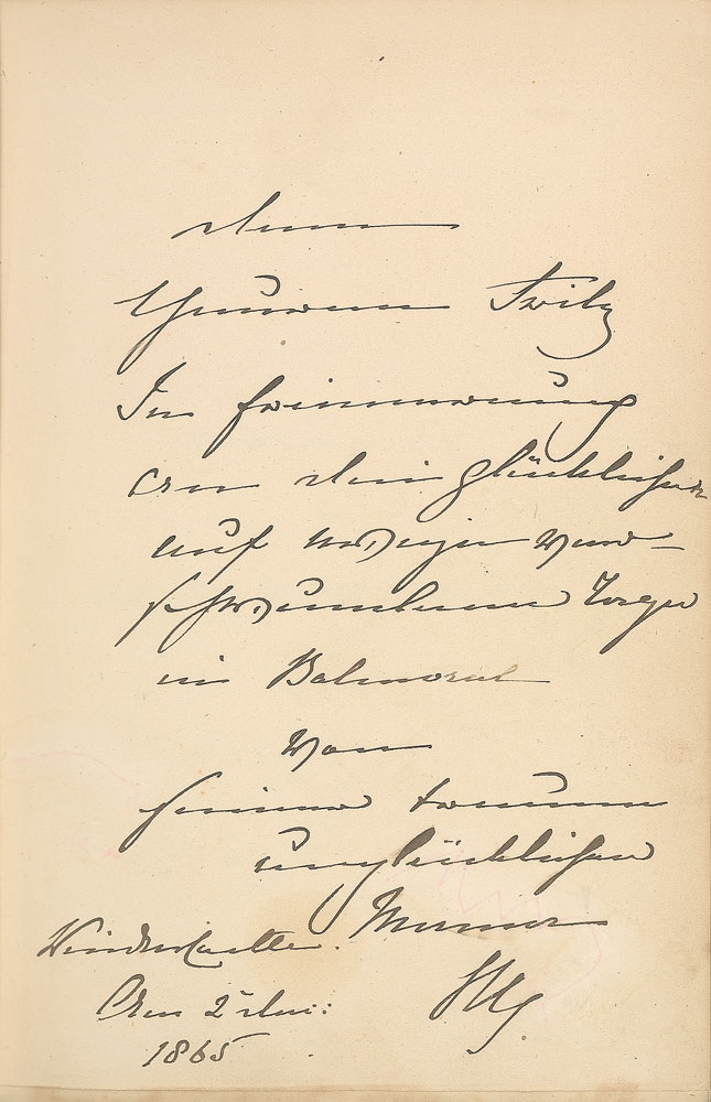 Signed book: Leaves from the Journal of Our Life in the Highlands. London: Smith, Elder & Co., 1865. Hardcover, 5.75 x 8.5, 145 pages. Signed and inscribed to her son-in-law German Emperor Frederick III on a free end page in German (translated): "To faithful Fritz, In remembrance of the happy days in Balmoral, Now disappeared forever, from his faithful unhappy mama, V. Reg., Windsor Castle, July 2, 1865.” The bookplate of the queen’s eldest child and the wife of Frederick, Victoria Adelaide, is affixed to the front pastedown. Autographic condition: fine, with a couple very light stains and a light pink mark toward the end of the inscription. Book condition: VG-/None. Princess Victoria Adelaide became engaged to Prince Frederick William of Prussia while he was visiting Balmoral Castle in 1855, a marriage designed to cement a dynastic alliance between the two nations. In addition to this book’s historic significance given its royal associations, this edition is an extreme rarity with hardly any recorded examples. Pre-certified PSA/DNA.