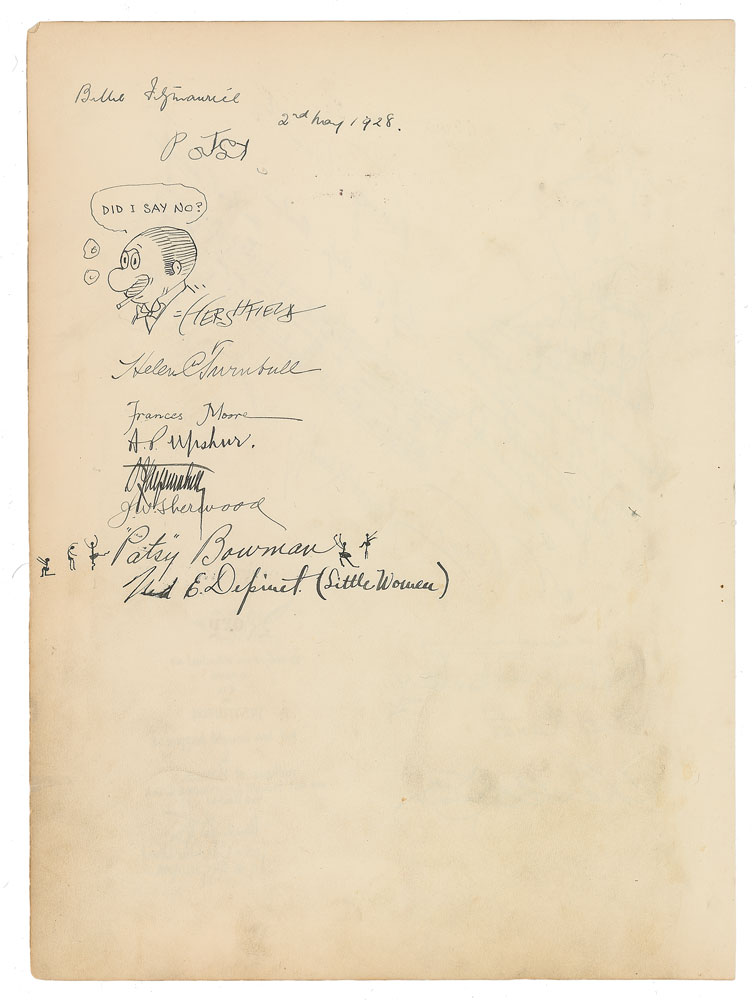 Original signed fountain pen self-portrait sketch by Chaliapin on an off-white 10.25 x 14 album page, signed and inscribed below, “F. Chaliapin, To Dear Roxy, 1928 March.” To the right is an AMQS by the important composer of liturgical music, Nicolai Kedroff, who pens a quote from his “Song of the Volga Boatman,” also signed by the members of the Kedroff Quartet. Also signed on the reverse by cartoonist Harry Hershfield (who adds a sketch), dancer Patricia Bowman (who sketches five tiny dancers around her name), and movie mogul Ned E. Depinet, as well as several others. In fine condition, with mild toning and soiling. Pre-certified PSA/DNA.