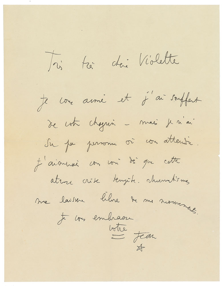 Untranslated ALS in French, signed “Jean,” one onionskin page, 8.25 x 10.5, no date. In fine condition, with a chip to right edge and central vertical and horizontal folds. Pre-certified PSA/DNA.