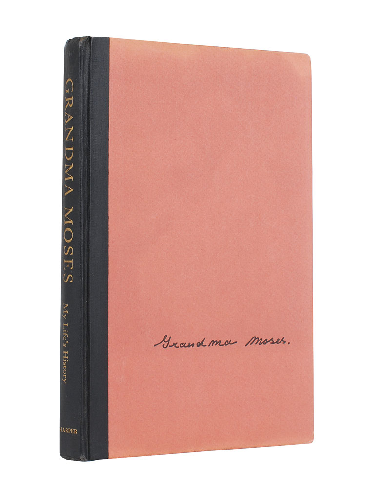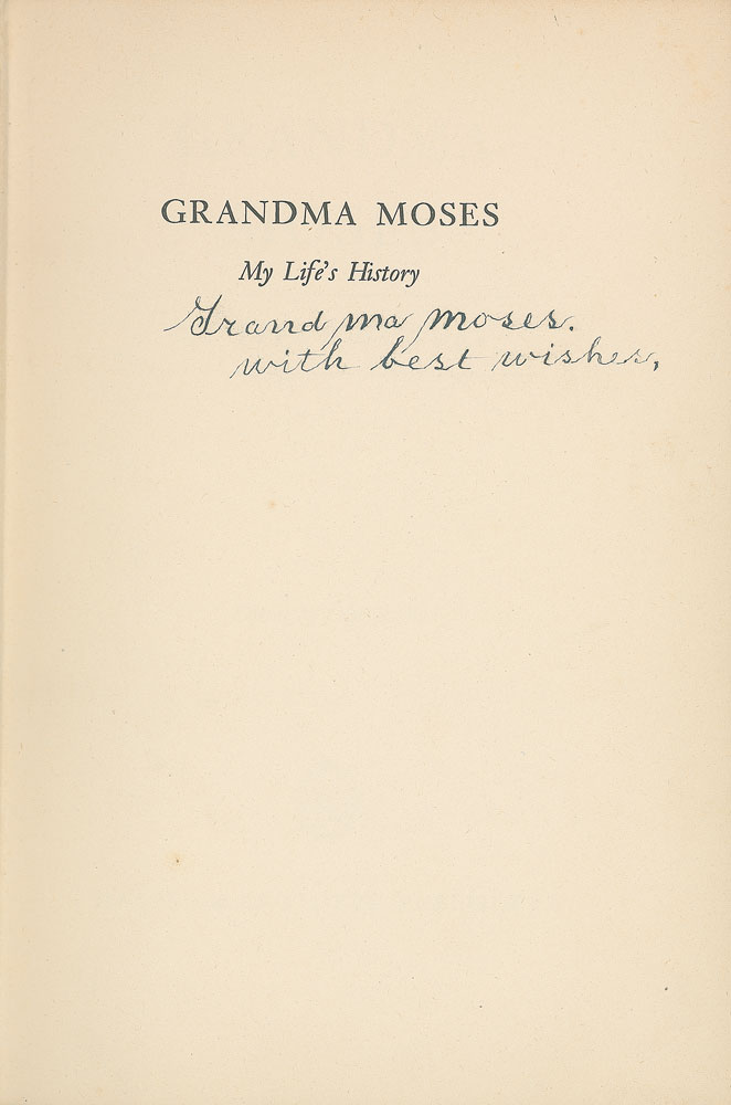 Signed book: My Life’s History. First edition. NY: Harper & Brothers, 1952. Hardcover, 6.5 x 9.5, 140 pages. Signed on the half-title page in fountain pen, “Grandma Moses, with best wishes.” In fine condition, with mild foxing and toning to pastedowns. Pre-certified PSA/DNA.