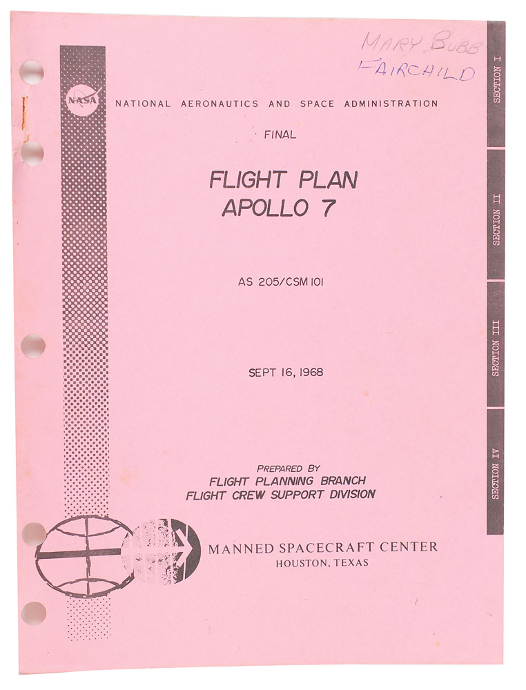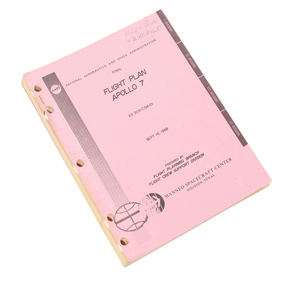 Unbound Apollo 7 flight plan manual entitled “Final Flight Plan, Apollo 7, AS 205/CSM 101,” approximately 200 pages, 8 x 10.5, September 16, 1968. The plan provides general notes on the mission, a detailed timeline, consumables analysis, and mission activities and detailed test objectives. A notation to the front cover reads, “Mary Bubb, Fairchild.” In fine condition. Mary Bubb was a longtime space program journalist who worked for Fairchild Publications.