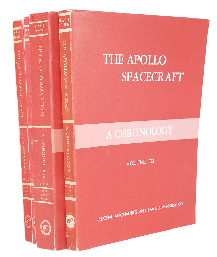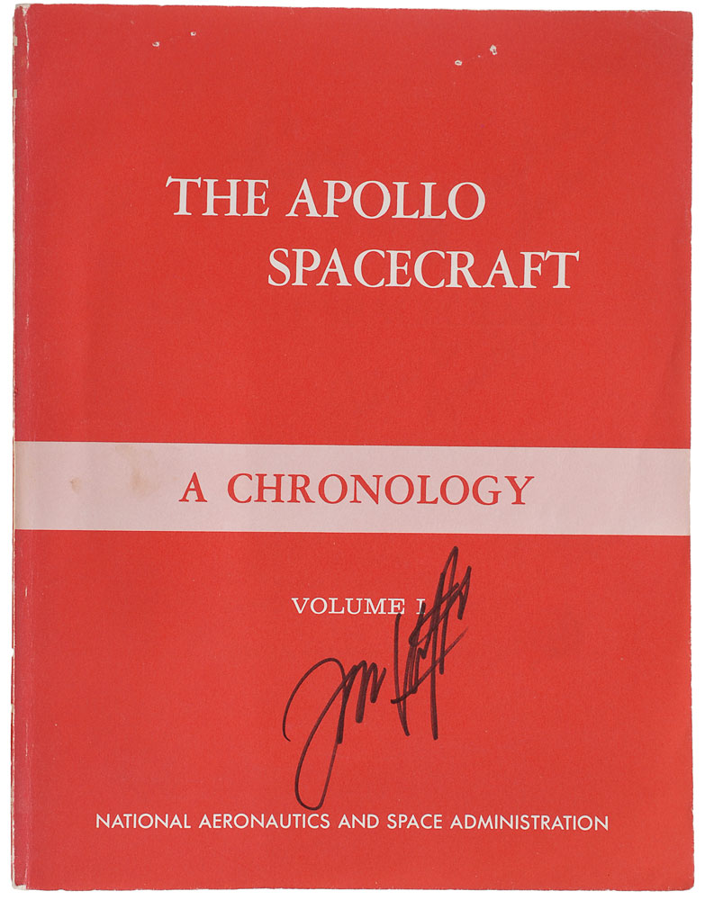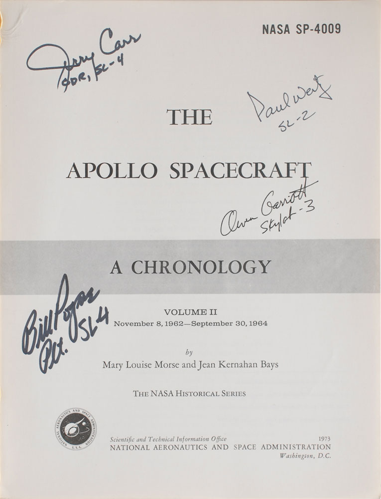Complete four-volume softcover set of The Apollo Spacecraft: A Chronology, dated from 1969 to 1978, each 8 x 10.25, signed on the title page of Volume 1 in blue and black felt tip, “Walt Cunningham, Apollo 7,” “Al Worden, Apollo 15,” “Richard Gordon, Apollo 12,” “Edgar Mitchell, Apollo 14,” and “Alan Bean, Apollo 12,” and on the title page of Volume 2 in black felt tip, “Jerry Carr, CDR, SL–4,” “Paul Weitz, SL–2,” “Owen Garriott, Skylab–3,” and “Bill Pogue, Plt. SL–4.” Also signed on the front cover of Volume 1 in black felt tip, “Tom Stafford.” In overall fine condition. Desirable even without the signatures, this exceptional full four-volume set is further enhanced by the presence of ten Apollo and Skylab astronauts. Pre-certified Zarelli Space Authentication.