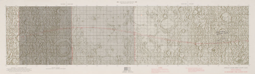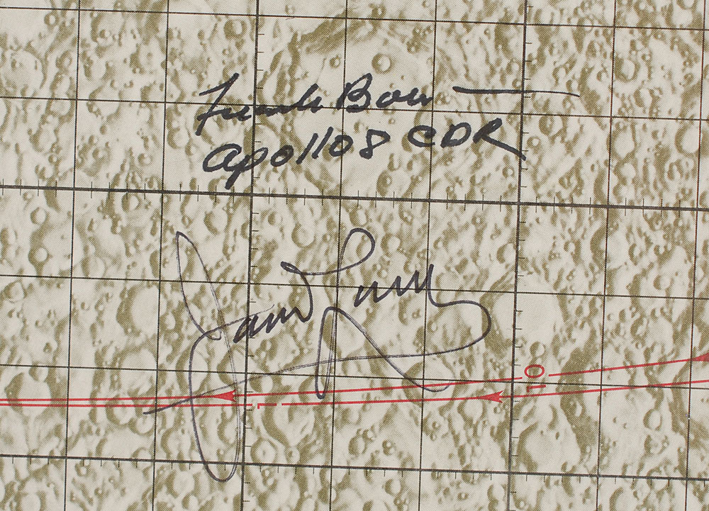 Appealing first edition of the Apollo 8 Lunar Orbit Chart for the mission’s 1st and 10th revolutions, 41 x 12, dated December 4, 1968, signed on the fourth panel in black felt tip, “Frank Borman, Apollo 8 CDR” and “James Lovell.” Lithographed by ACIC 12–68, and prepared under the direction of the Department of Defense by the Aeronautical Chart and Information Center. In fine condition. Accompanied by an Astronaut Central certificate of authenticity for the Borman signature. Pre-certified Zarelli Space Authentication.