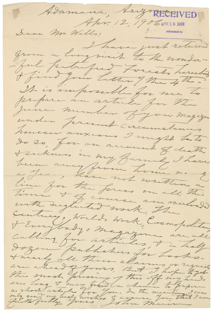 ALS, one page, 8.25 x 12.25, April 12, 1906. Written from Adamana, Arizona, a letter to Mr. Wells, in full: “I have just returned from a long visit to the wonderful petrified forests hereabouts & find your letter of the 4th. It is impossible for me to prepare an article for the June number of your magazine under present circumstances however anxious I might be to do so, for on account of death & sickness in my family I have been away from home for nearly a year, have not written a line for the press in all this time & of course am overloaded with neglected work. The Century, World’s Work, Cosmopolitan, & Everybody’s Magazines are all calling for articles, & a half dozen publishers for books, & nearly all their claims or requests are ahead of yours. But I hope to get the most pressing of this off my hands ere long & may find a chance to prepare a short article for you. In the meantime I can only send my best wishes & assure you that I am faithfully yours.” In fine condition. During the late months of 1905, Muir situated himself at the small train-stop town of Adamana to study closely the region’s fossils and petrified trees for a series of articles for Cosmopolitan magazine. Distraught by the Santa Fe’s wolfish railroad practice of carting off the petrified logs for tourist trade, Muir urged his friend, President Theodore Roosevelt, to intervene. The 1906 creation of the Petrified Forest National Monument marked one of the first instances in which the presidentially authorized Antiquities Act was employed. Pre-certified PSA/DNA.