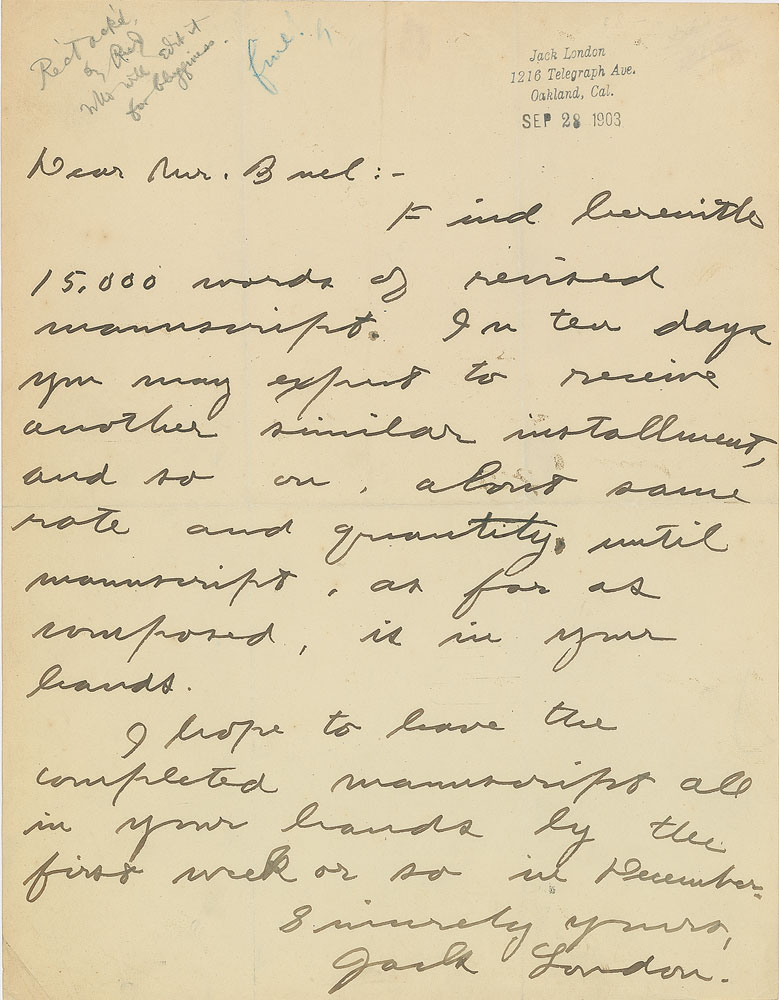 ALS, one page, 8.5 x 11, no date but postmarked September 28, 1903, with London’s personal ink stamp. Letter to C. C. Buel, the editor of The Century Magazine, in full: “Find herewith 15,000 words of revised manuscript. In ten days you may expect to receive another similar installment, and so on, about same rate and quantity, until manuscript, as far as expected, is in your hands. I hope to leave the completed manuscript all in your hands by the first week or so in December.” In fine condition. Upon his return from the Alaskan wilderness, London began freelancing with numerous weekly and monthly publications. After submitting ‘Diablo–The Dog’ to Cosmopolitan in 1902, London decided to write a kinder companion piece that would redeem the species he had come to admire during his time in the Yukon. Serialized in the summer of 1903, The Call of the Wild was published in book form a month later and promptly rewarded London with international fame. Pre-certified PSA/DNA.