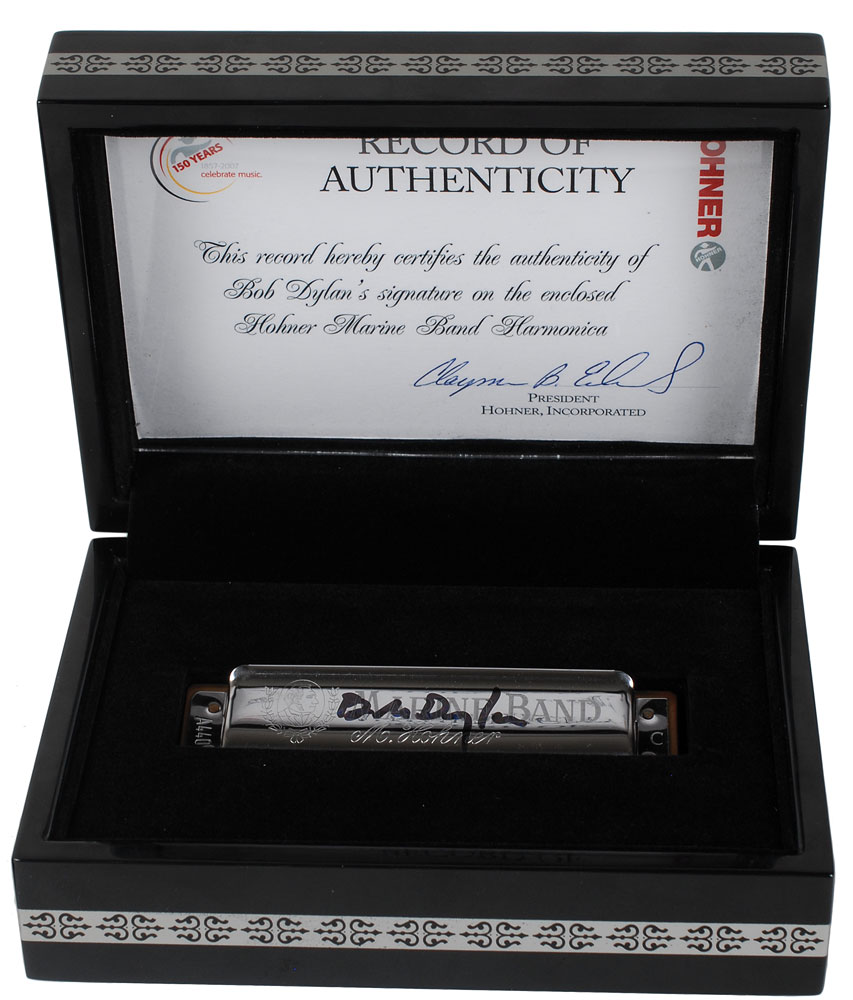 Exceptionally desirable limited edition Hohner Marine Band harmonica in the key of C, signed across the top in black felt tip by Dylan. Includes a beautiful handcrafted inlaid ebony box with a letter of authenticity from Hohner displayed within the lid certifying Dylan’s signature. In fine condition. Hohner created only one hundred of these special collectibles. Although Dylan began playing the harmonica in high school, it wasn’t until the fall of 1960 that his ‘chugging’ style began to develop. By the time of his arrival in New York City in January 1961, he was an adept player, and the sound of the harmonica characterizes many of his earlier works. A remarkable collectible from Dylan, who is doubtlessly the most sought-after living legend. Pre-certified REAL.