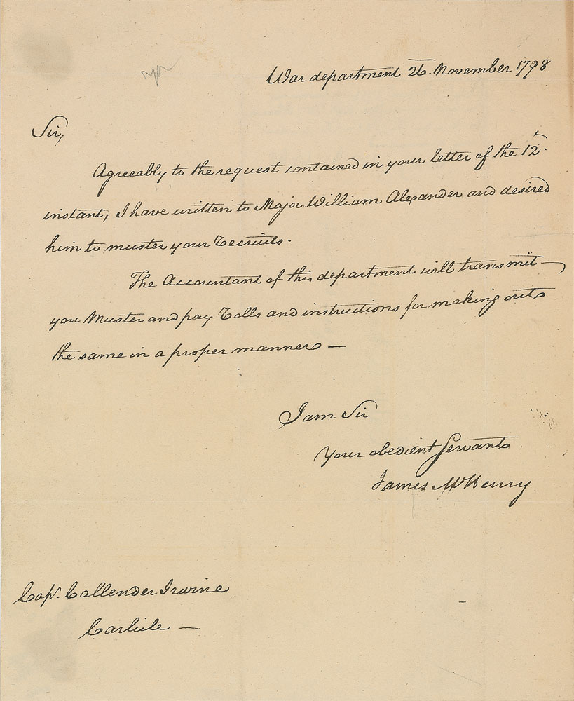 Signer of the United States Constitution from Maryland and the namesake of Fort McHenry (1753–1816) who also served as a delegate to the Continental Congress from Maryland, and the third United States Secretary of War. LS, one page, 8 x 9.75, November 26, 1798. From the War Department, a letter to Captain Callender Irvine, in full: “Agreeably to the request contained in your letter of the 12th instant, I have written to Major William Alexander and desired him to muster your recruits. The Accountant of this department will transmit you muster and pay Tolls and instructions for making onto the same in a proper manner.” Annotated on the reverse of the second integral page in the hand of Irvine. In fine condition. Pre-certified PSA/DNA.