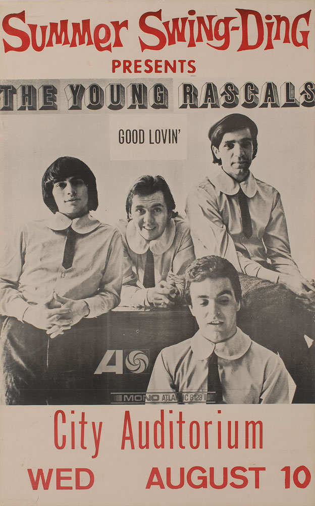 Color 10.5 x 17 poster for a Young Rascals concert presented by Summer Swing-Ding at the Colorado Springs City Auditorium on August 10 [1966], showing the album cover for the band's self-titled full-length debut. Slight scattered soiling, some horizontal bends, and a few small tears to edges, otherwise fine condition.