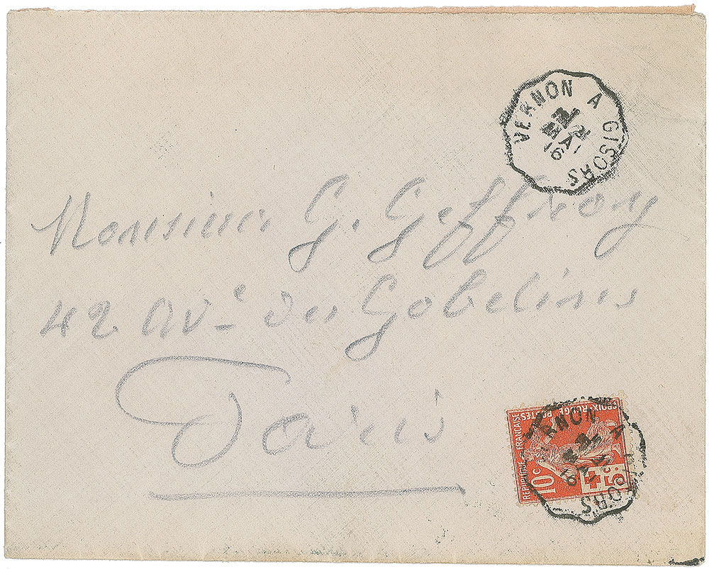 Hand-addressed mailing envelope, 5 x 4.25, addressed in pencil by Monet to influential art critic and author Gustave Geffroy, “Monsieur G. Geffroy, 42 Ave. des Gobelins, Paris.” Envelope bears an affixed 10-cent French postage stamp and is postmarked Vernon A Gisors, May 16, 1922. In fine condition. Geffroy was a founding member of the literary organization Academie Goncourt in 1900 and noted as one of the earliest historians of the Impressionist movement. He knew and championed Monet after meeting him in Belle-Ile-en-Mer in 1886, where Monet was working on paintings of the local oceanside rock formations which astounded the Paris art world when first exhibited in 1887. Pre-certified PSA/DNA.