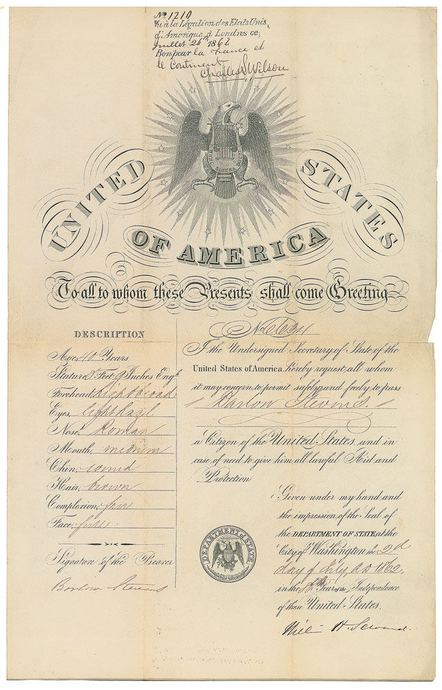 Civil War–dated partly-printed DS, one page, 11.25 x 18, July 2, 1862. Official passport issued to Barlow Stevens, providing instructions to “permit safely and freely to pass, Barlow Stevens, a Citizen of the United States.” Also filled out along the left side with his physical description. Signed at the conclusion by Seward as secretary of state. In very good condition, with repaired partial separations to folds. Pre-certified PSA/DNA.