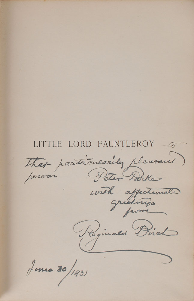 English-American artist and illustrator (1856–1943) best known for his depiction of the titular hero of Frances Hodgson Burnett's 1886 novel Little Lord Fauntleroy. Fabulous collection of three items, including a signed book: Little Lord Fauntleroy. Later printing. NY: Charles Scribner's Sons, 1897. Hardcover, 5.25 x 7.5, 290 pages. Signed and inscribed on the half-title page in ink, “To that particularly pleasant person Peter Parke, with affectionate greetings from Reginald Birch, June 30, 1931.” On the preceding page, Birch paints a magnificent watercolor and ink scene. Also includes two ALSs by Birch, both dated 1940, one featuring a large sketch at the top. In overall fine condition. Pre-certified PSA/DNA.