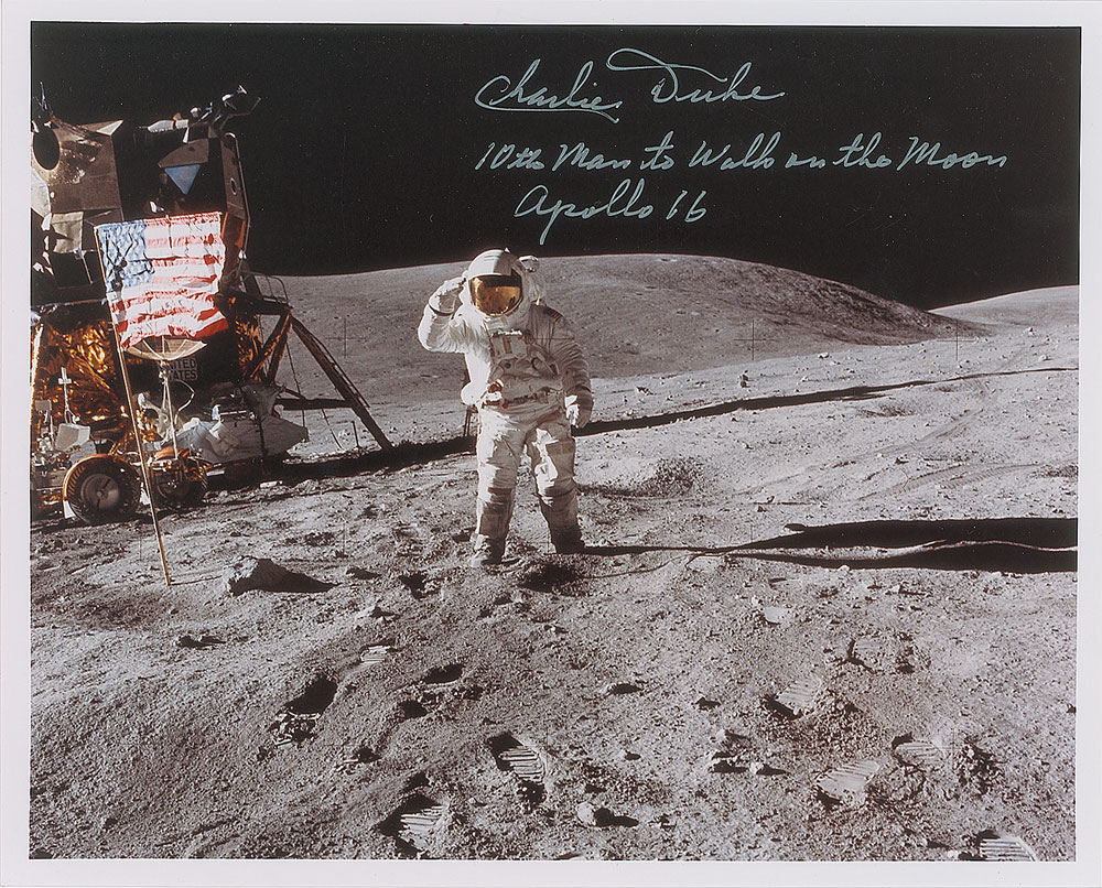Color satin-finish 10 x 8 photo of Duke saluting the American flag on the lunar surface, signed in silver ink, “Charlie Duke, 10th Man to Walk on the Moon, Apollo 16.” In fine condition. Pre-certified Zarelli Space Authentication.