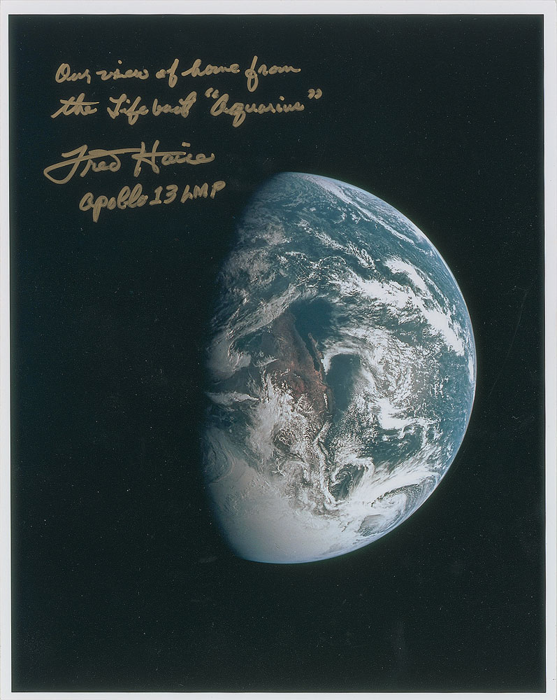 Color satin-finish 8 x 10 photo of the Earth, signed in gold ink, “Our view of home from the Lifeboat ‘Aquarius,’ Fred Haise, Apollo 13 LMP.” In very fine condition. Pre-certified Zarelli Space Authentication.